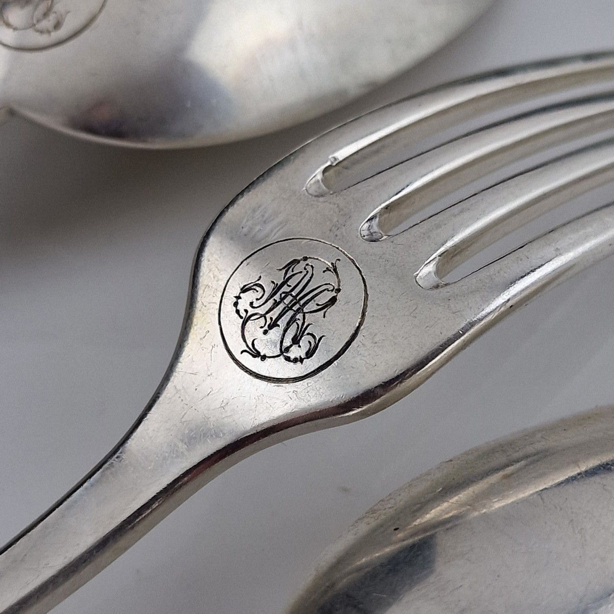 BELLE MENAGERE DE COUVERTS ET DE COUTEAUX POUR 18 PERSONNES 115 PIECES en argent Minerve 950 Millièmes par CARDEILHAC de Style Louis XVI Circa 1910 à décor de cannelures à asperges et feuilles d'eau. Les fourchons et cuillerons gravés du monogramme BM