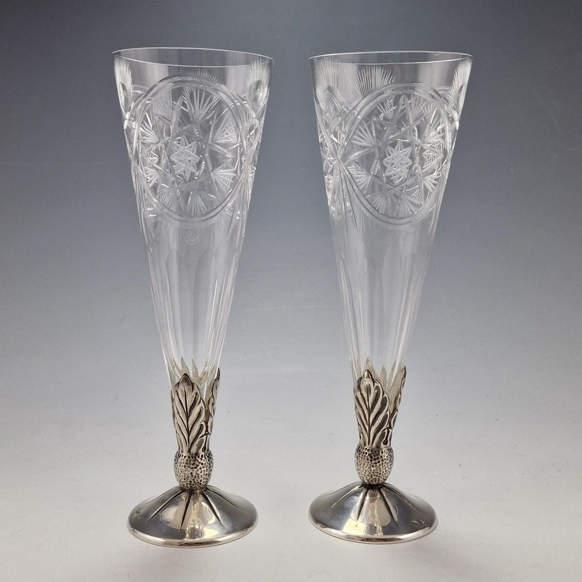 SUITE DE 6 ORIGINALES FLUTES A CHAMPAGNE à buvant conique en cristal blanc taillé et argent 915 Millièmes - Espagne, Circa 1960. Le cristal à décor de motifs géométriques et pans coupés, le pied orné de feuillages surmontant un fruit