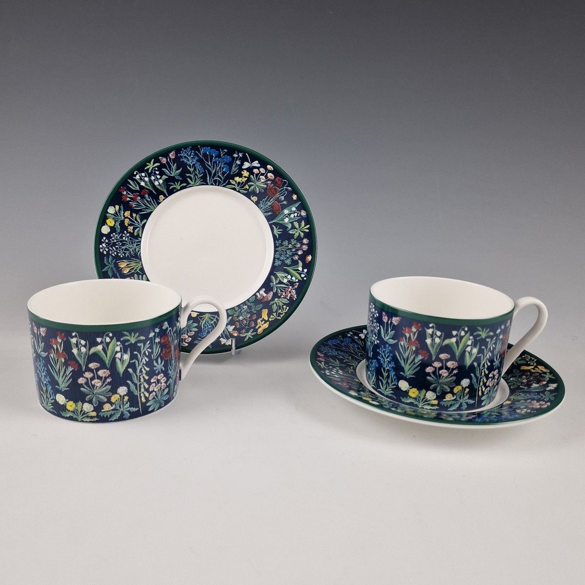 CHRISTIAN DIOR - MODELE LICORNE - 6 TASSES A THE - H. 6 cm ET LEUR SOUCOUPE en porcelaine blanche Circa 1980 à décor polychrome d'une frise de fleurs, champignons et papillons sur fond bleu nuit, le bord à liseré vert