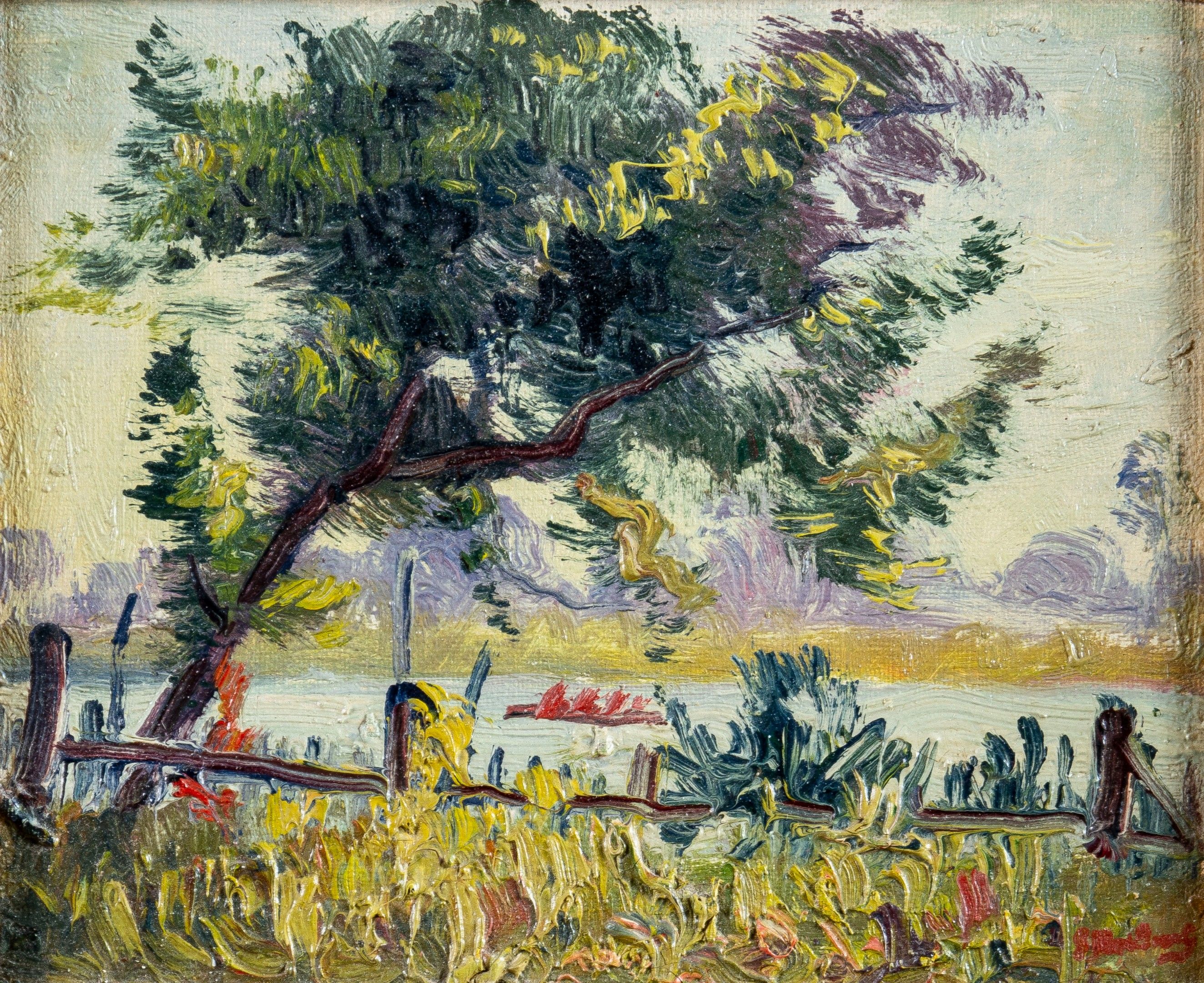 Ecole Française du XXème siècle, Au bord du canal Huile sur panneau signée en bas à droite et cachet d'atelier au revers 17x20,5cm