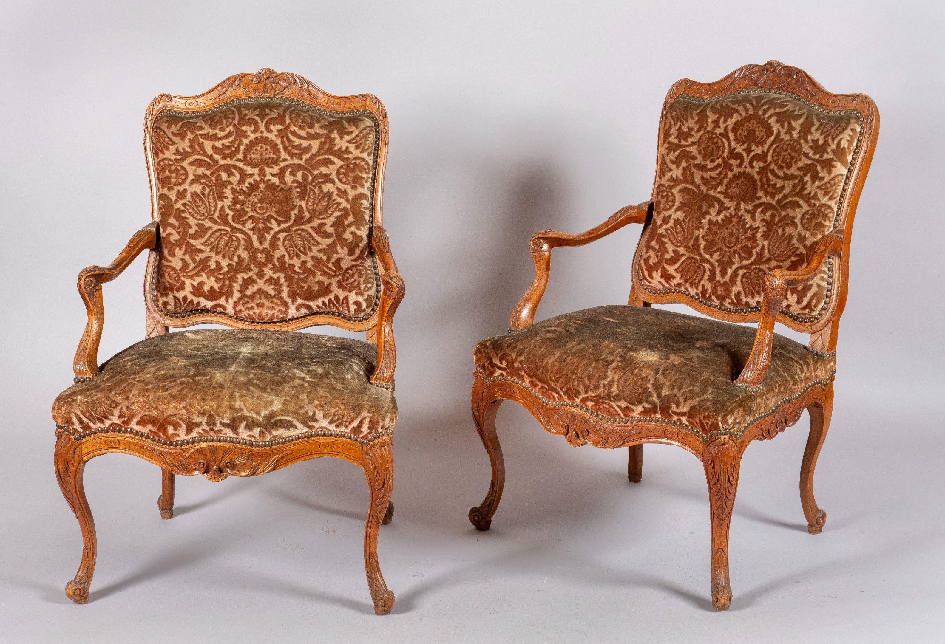 Paire de fauteuils à dossier plat en bois naturel mouluré et sculpté à décor de coquilles et acanthes Style Louis XV 94x63x50cm
