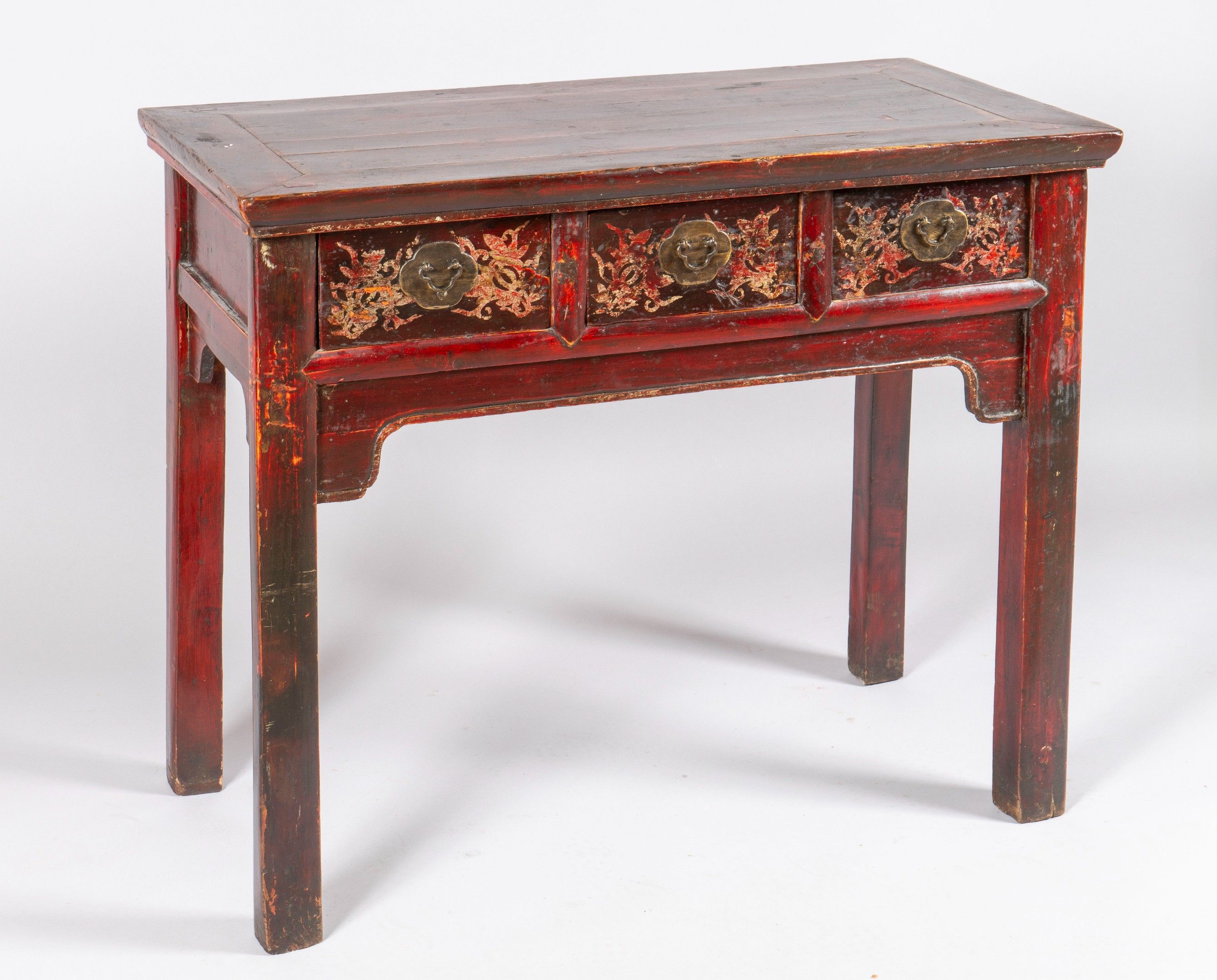 Chine, XXème siècle, Console en bois laqué rouge, elle ouvre à 3 tiroirs en ceinture à décor de fleurs stylisées Usures à la patine