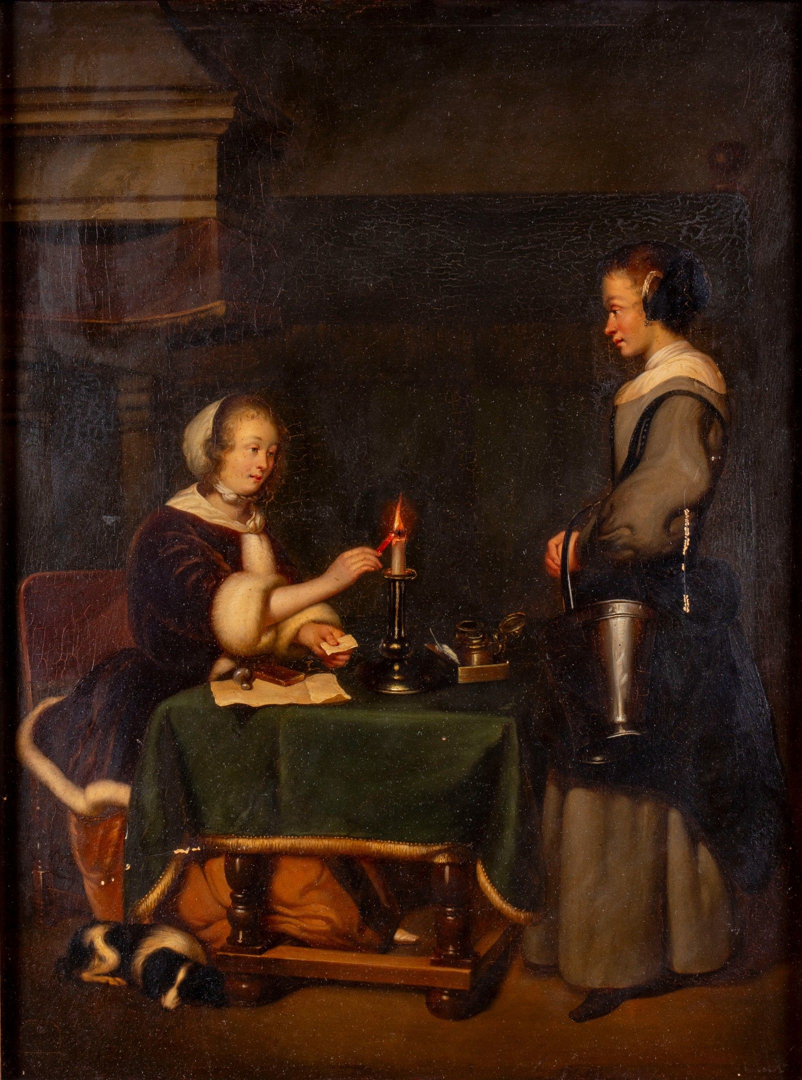 Ecole du Nord du XIXème siècle, La lettre, Huile sur panneau 50x36,5cm
