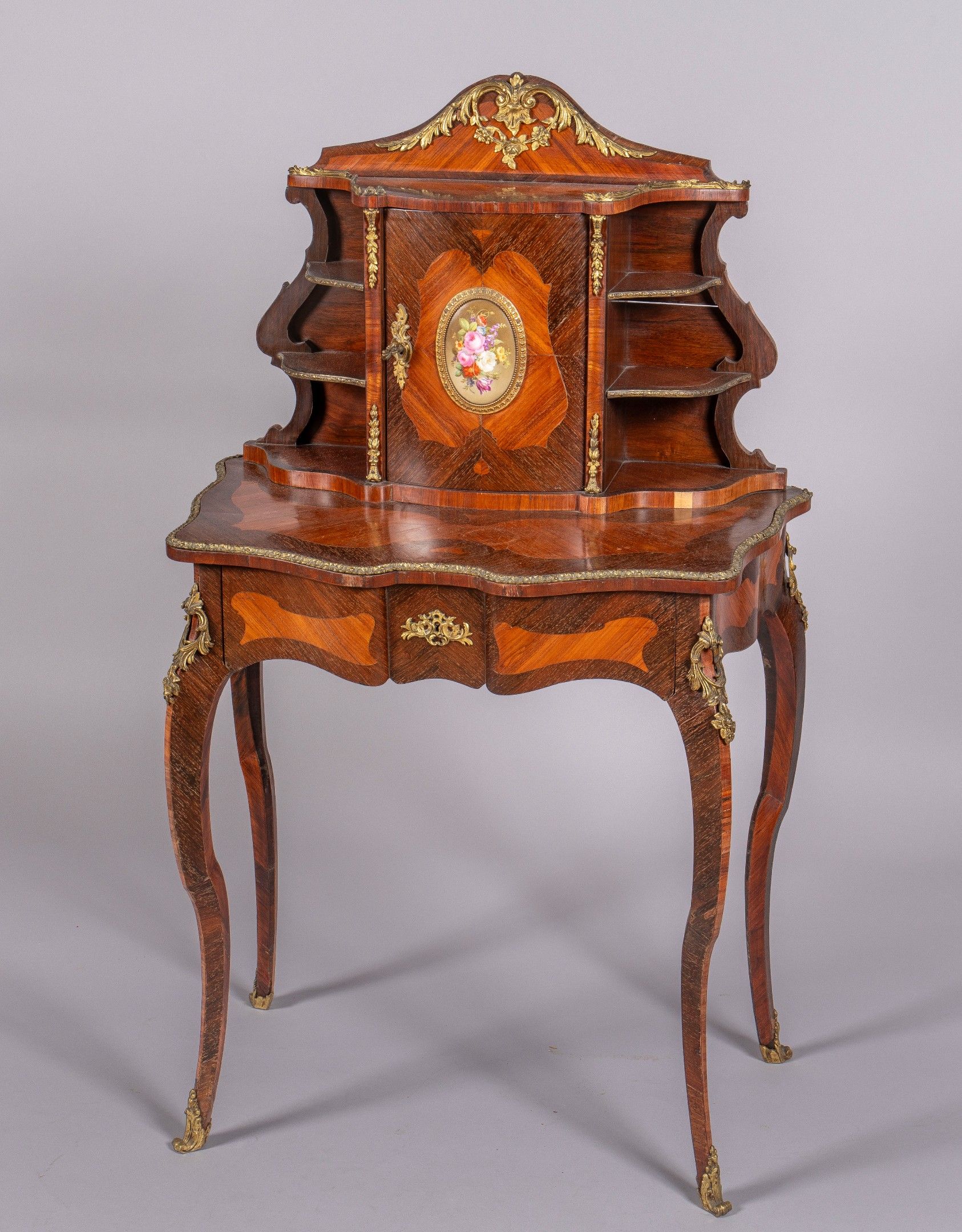 Bureau à gradin de dame en bois de placage marqueté en feuilles dans des encadrements de filets, il ouvre à un tiroir en ceinture découvrant une tablette à écrire, le cadrin ouvrant à une porte à décor d’une plaque de porcelaine et flanqué de petites étagères, il repose sur des pieds cambrés