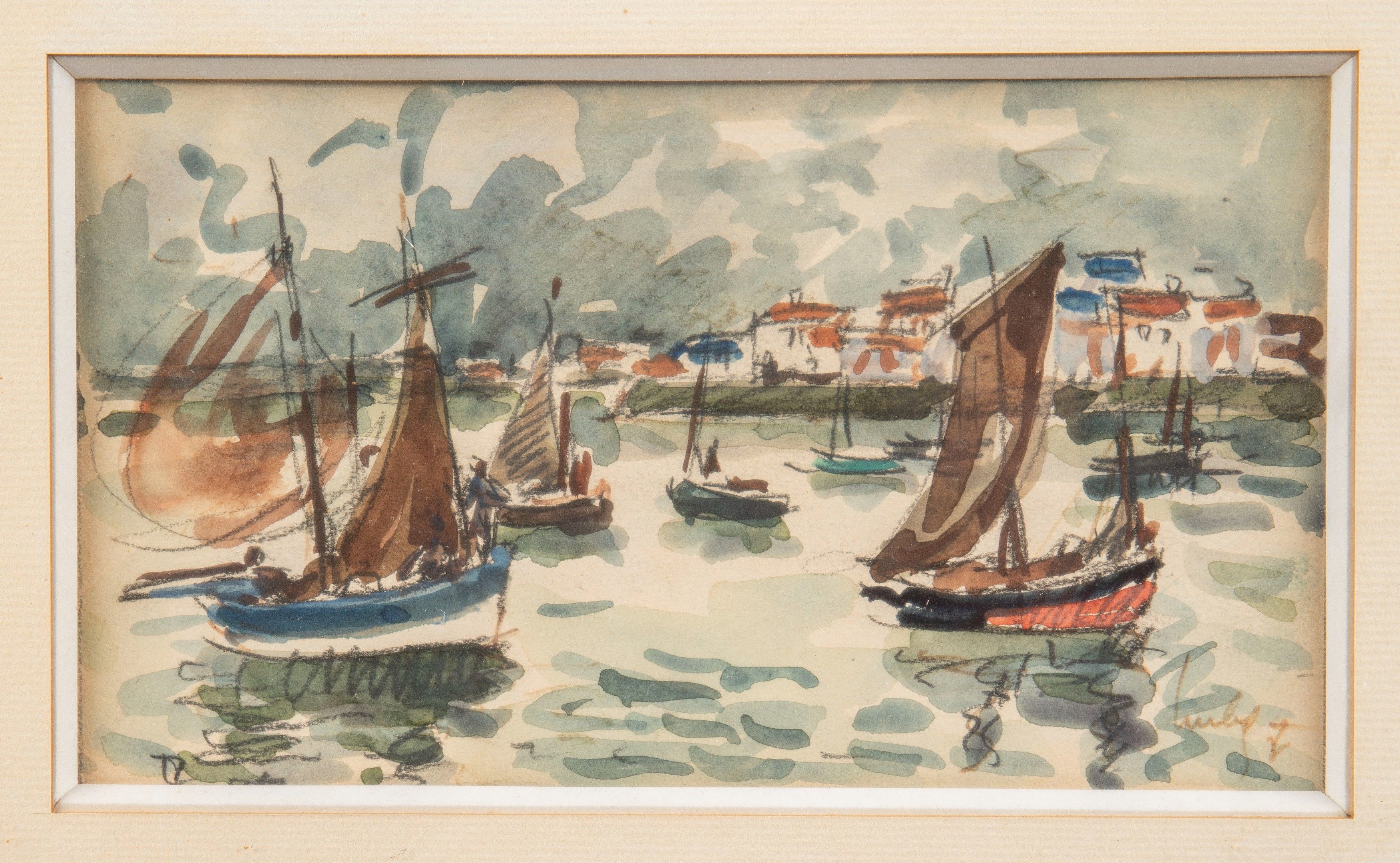 Fernand Herbo - L’entrée du Port - Aquarelle encadrée signée en bas à gauche - 11,5cm x 22 cm.