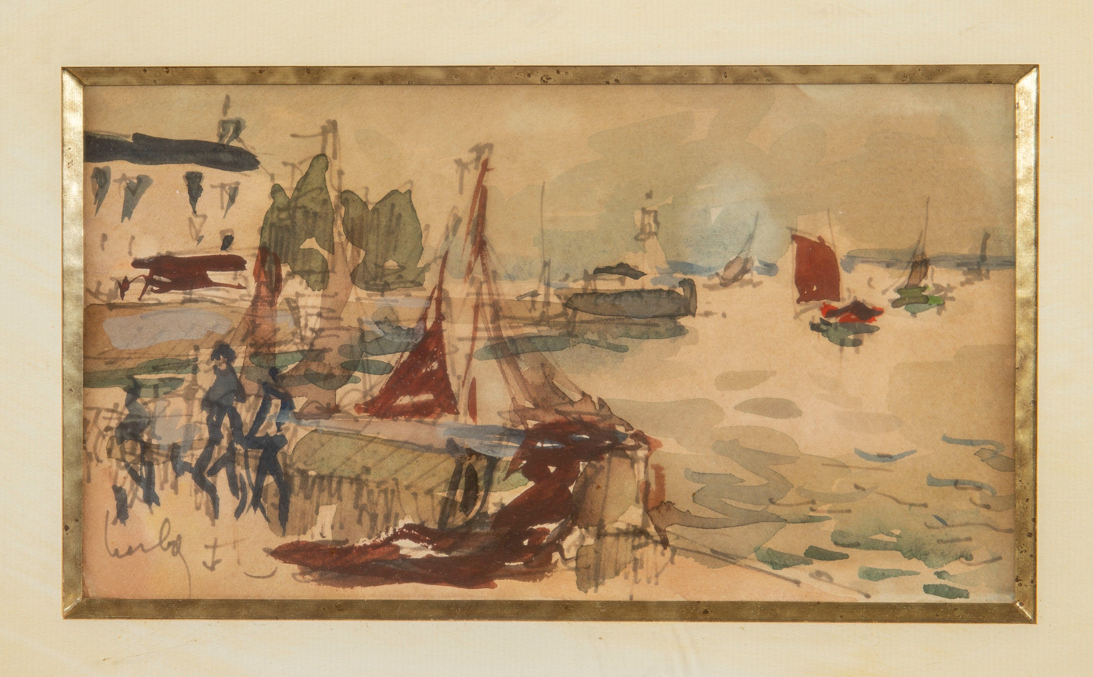 Fernand HERBO - Scène animée de personnages et de bateaux à voile - Aquarelle sur papiers signée en bas à gauche - 12 x 21 cm.