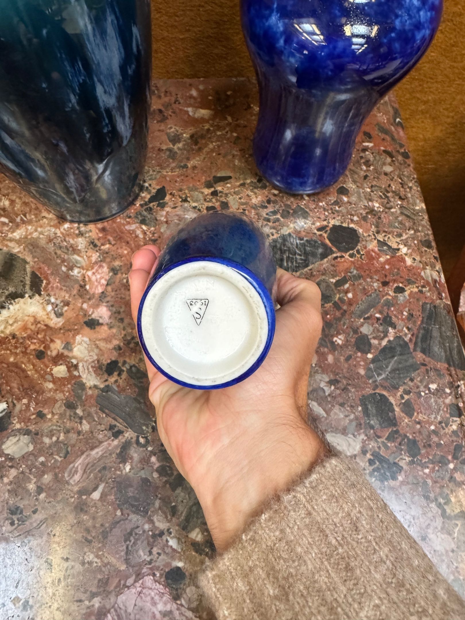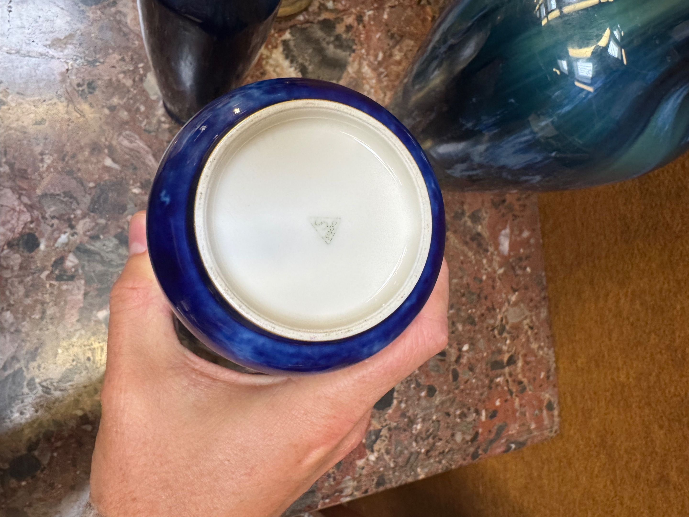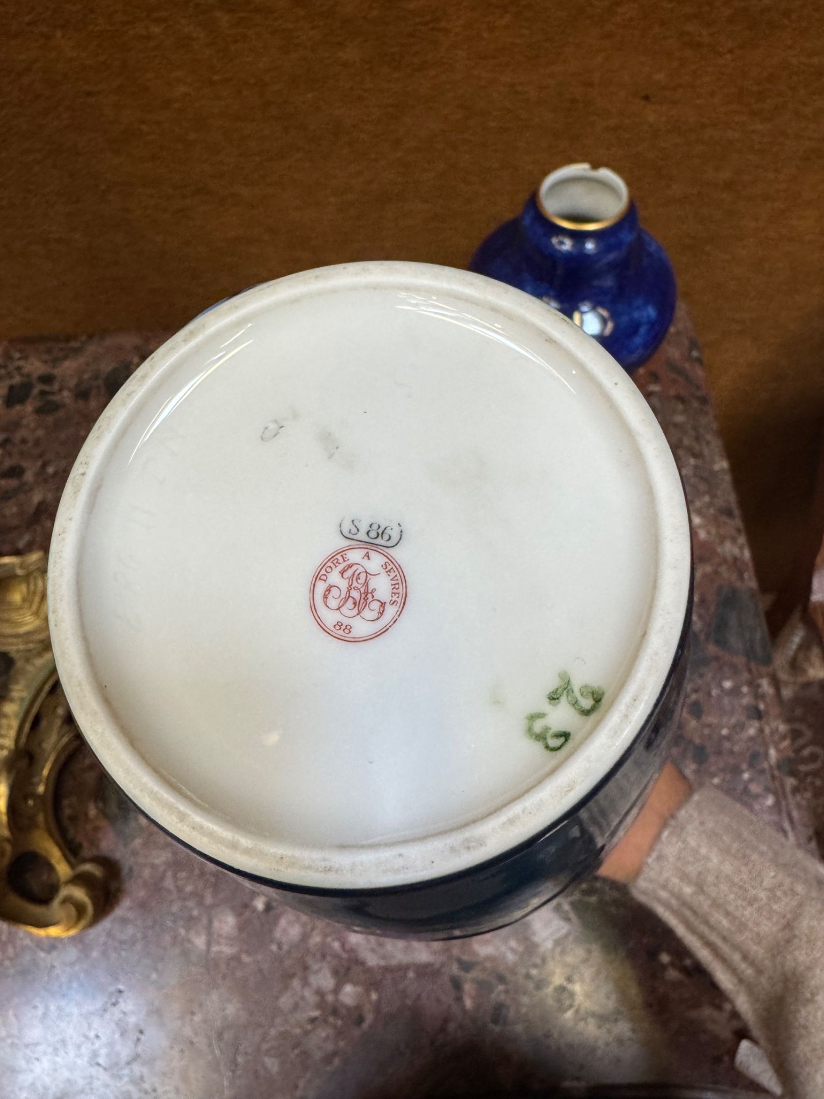 Sèvres Manufacture de, Ensemble de 3 vases en porcelaine à fond bleu. Signés (accidents) vendu en l'état.