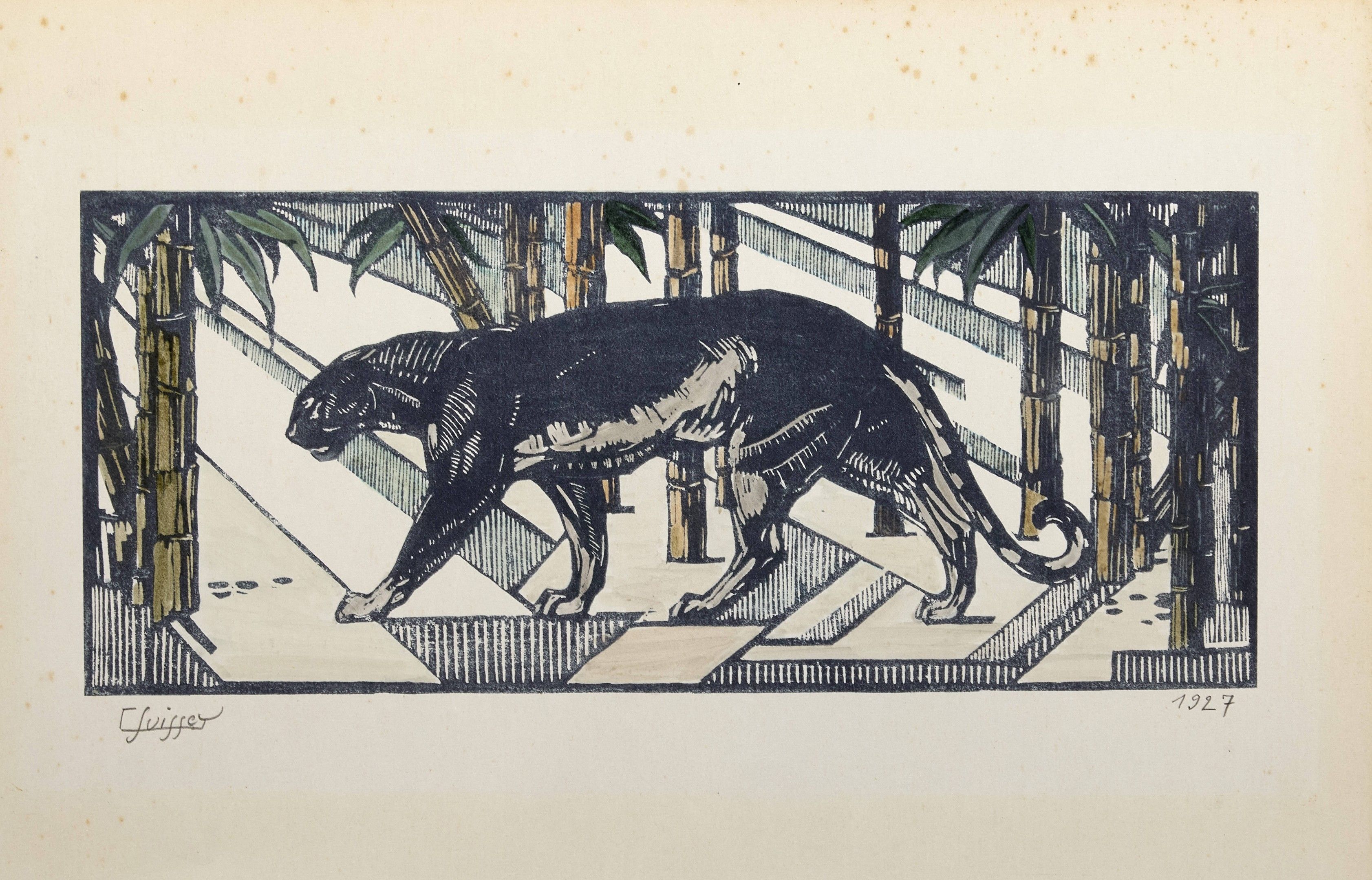 An engraved woodcut and watercolor “Panthère marchant parmi les bambous” proof on Japanese paper, signed and dated 1927 by Gaston Suisse - 1927 11.65 × 18.03 in.