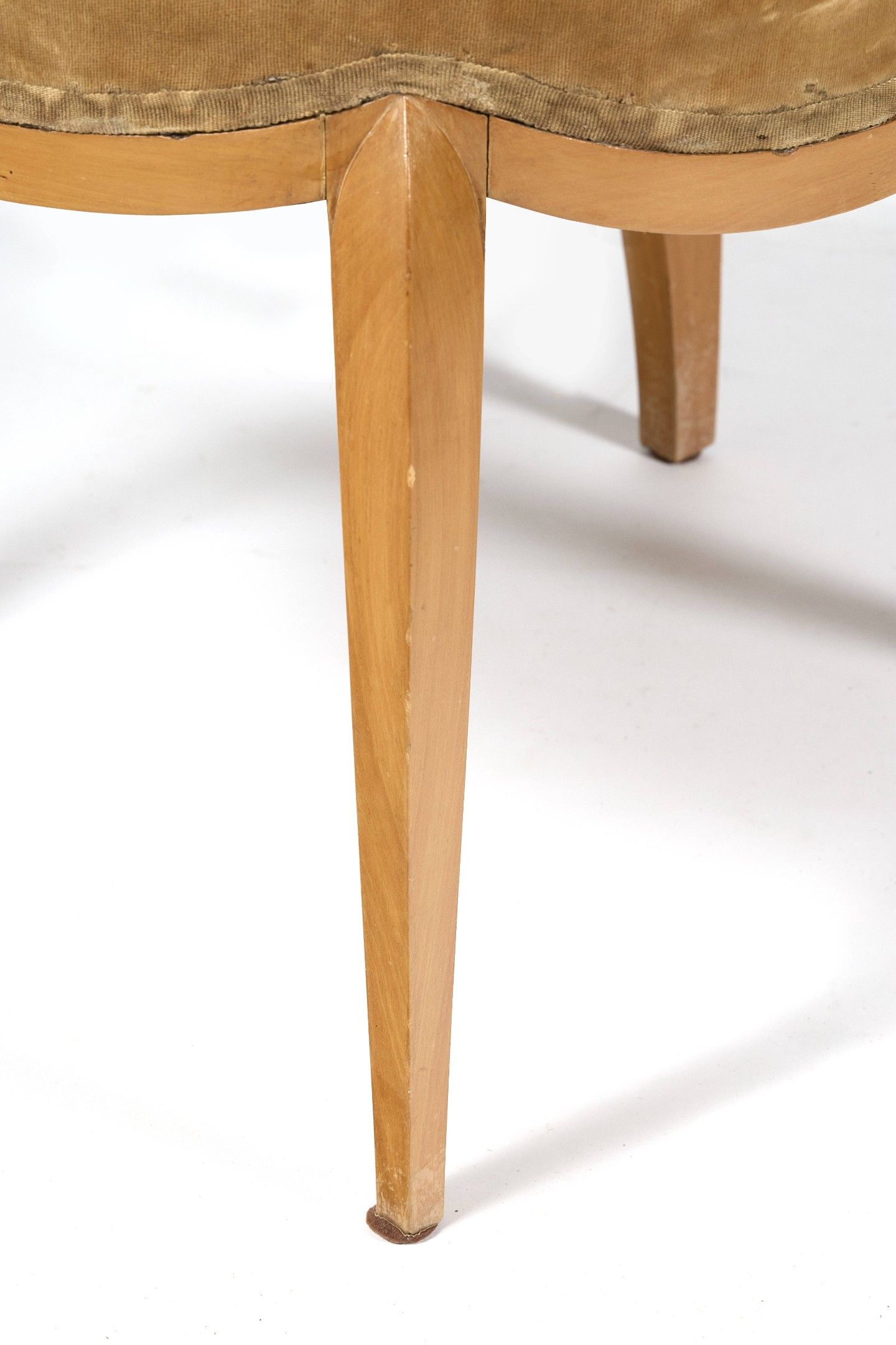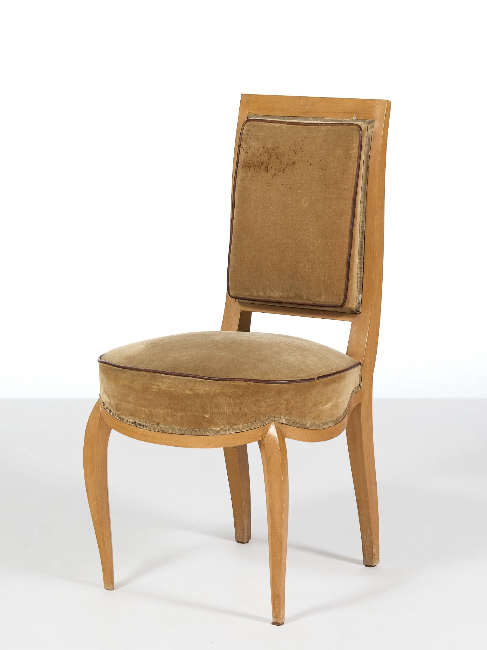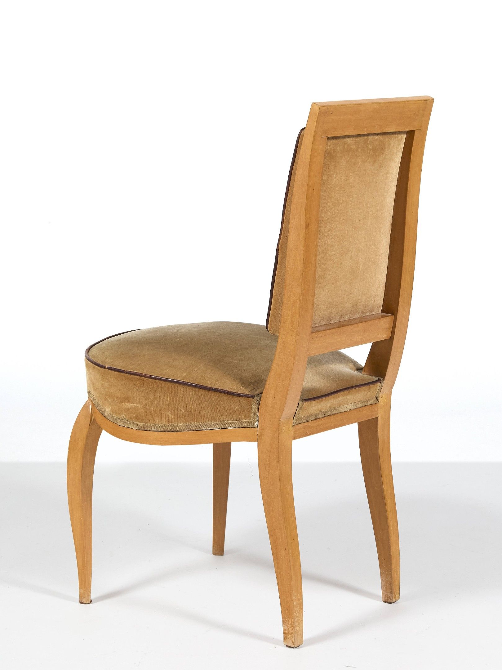 Chaise en sycomore à ceinture basse en découpe galbée et piètement avant en volute. Garniture de l’assise et du dossier recouverts de velours miel passepoilés de cuir brun d’origine