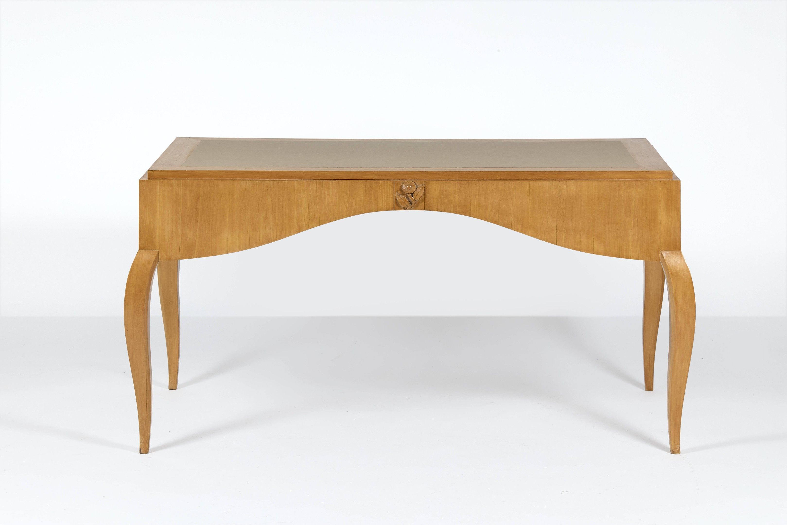 Bureau en sycomore ouvrant par deux tiroirs à fermeture centralisée, à ceinture ornée de motifs décoratifs sculptés par Joseph Monin (1903-2000) représentant deux dauphins affrontés et un motif floral coté visiteur. Sous main en cuir crème refait à neuf. Prises en métal
