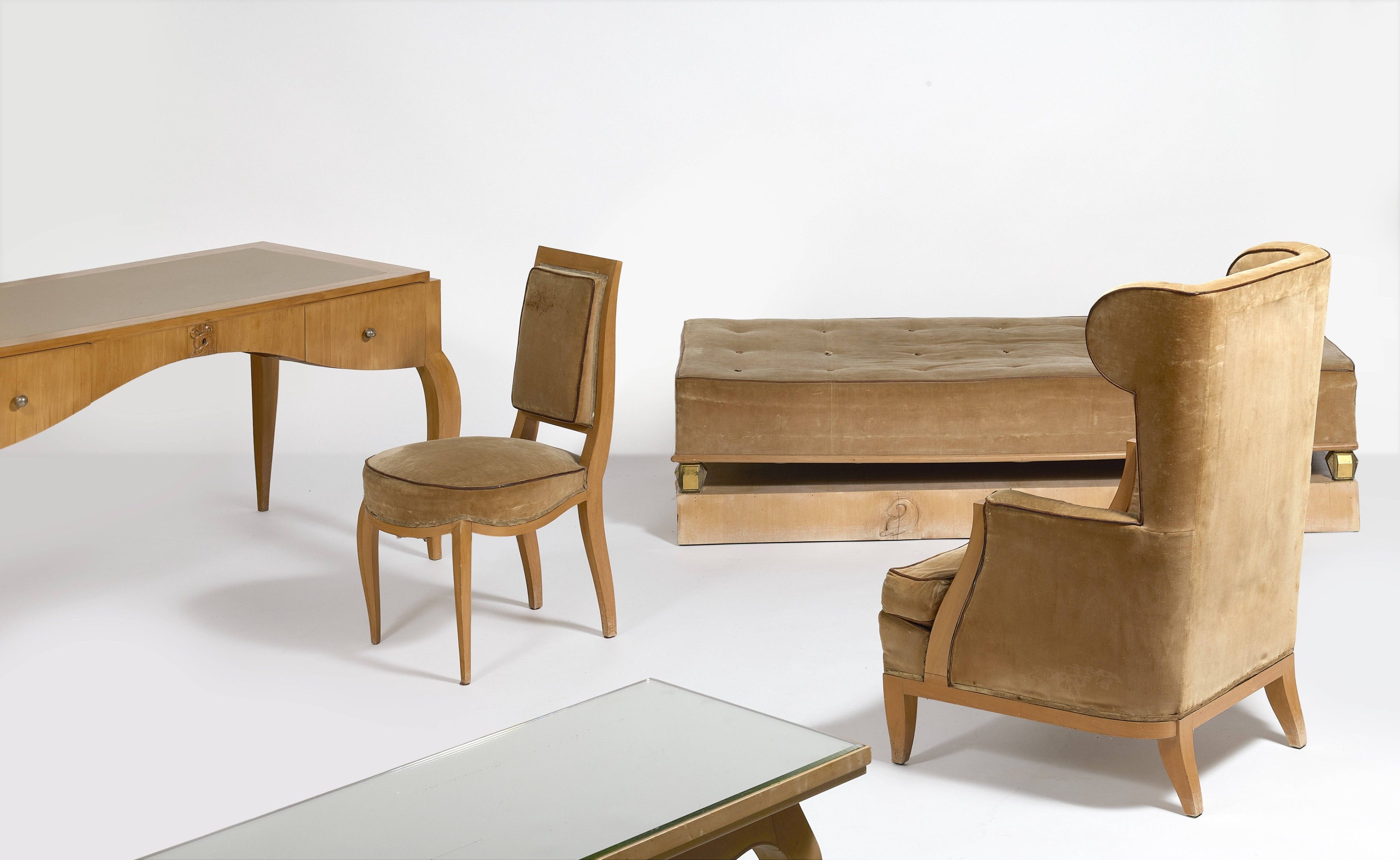 A sycamore desk and chair with carved motifs by Joseph Monin (1903-2000), original velvet with brown leather piping, by André Arbus - circa 1930