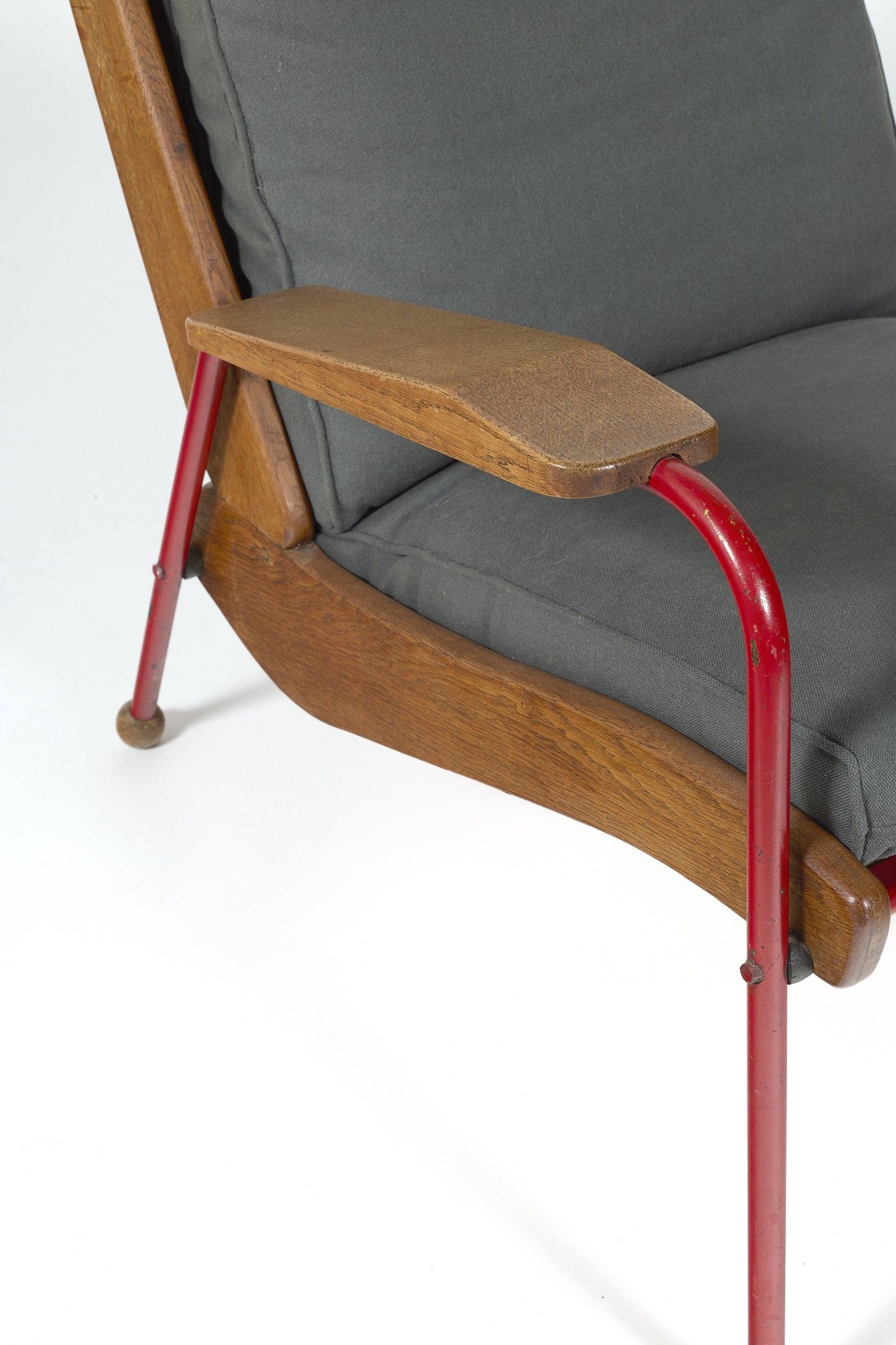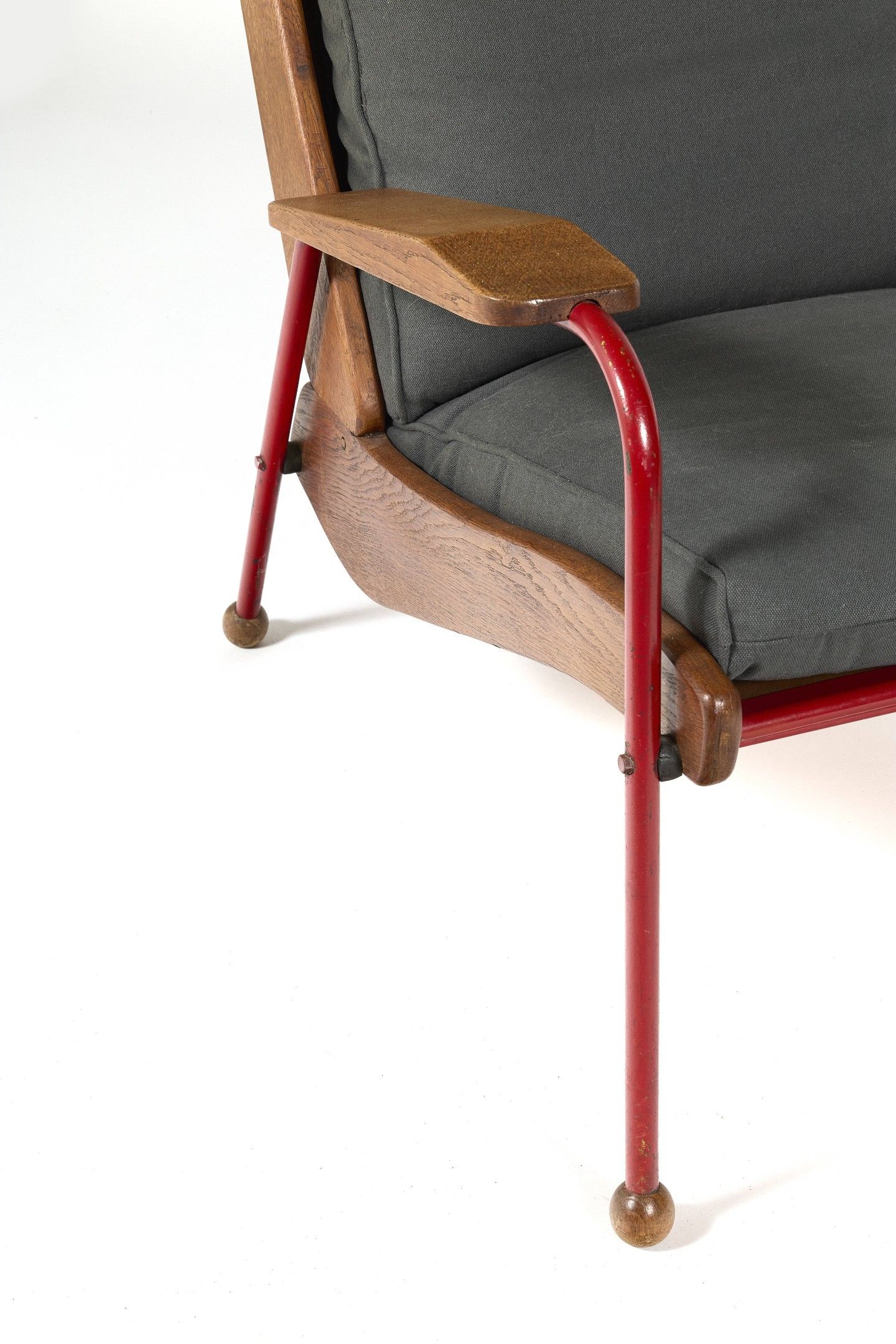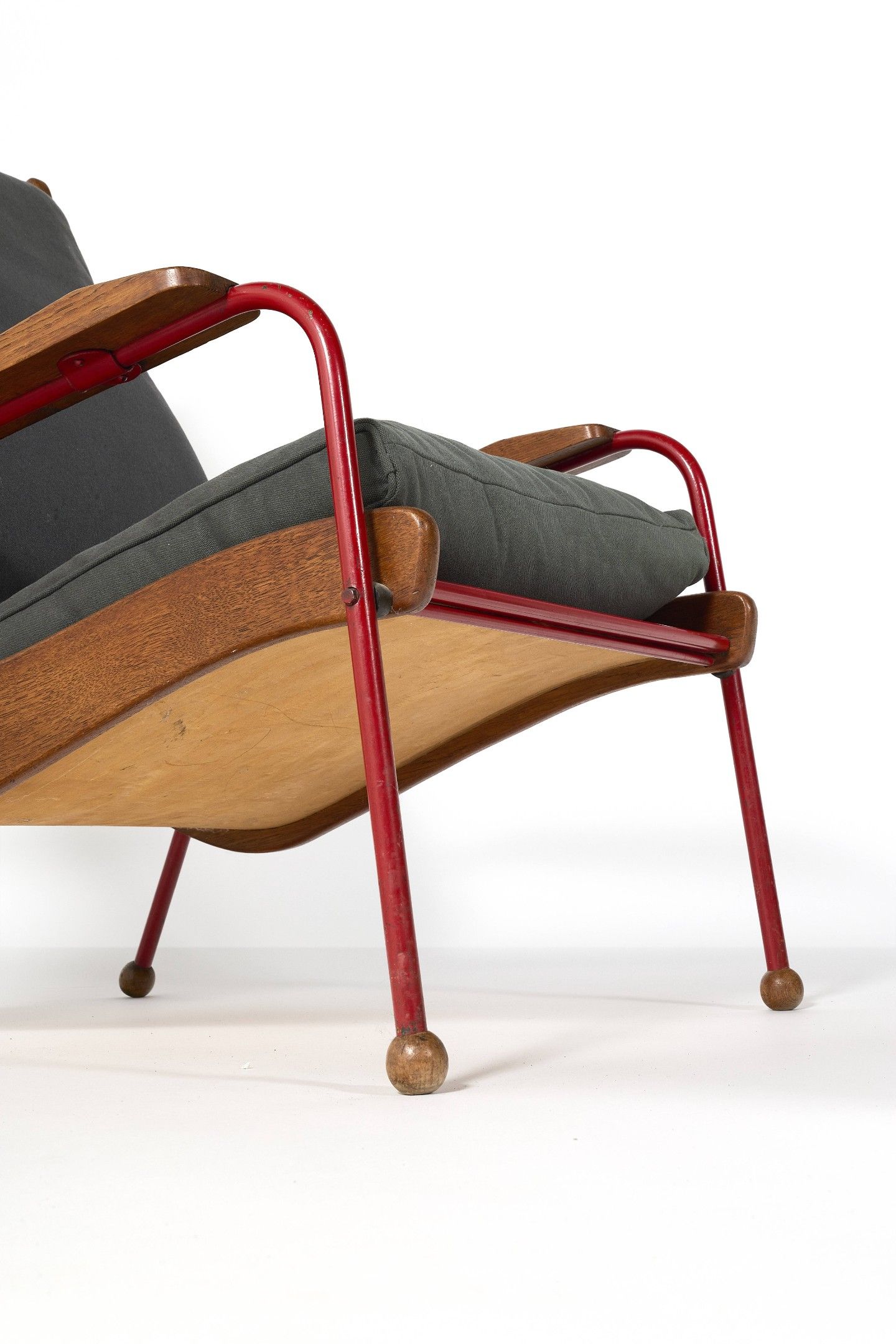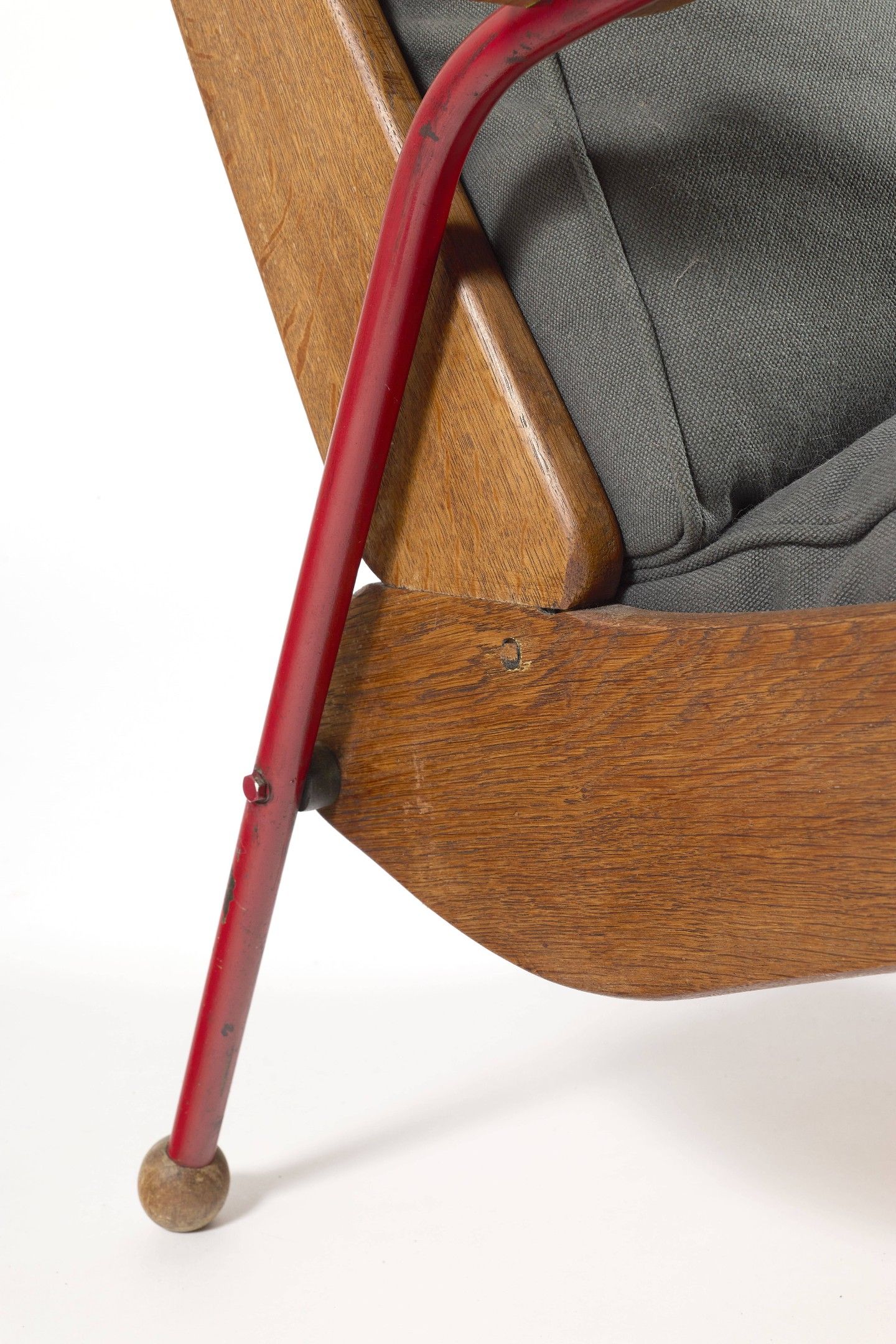 Tube et tôle d’acier peints en rouge «corsaire», chêne et contreplaqué de chêne, caoutchouc