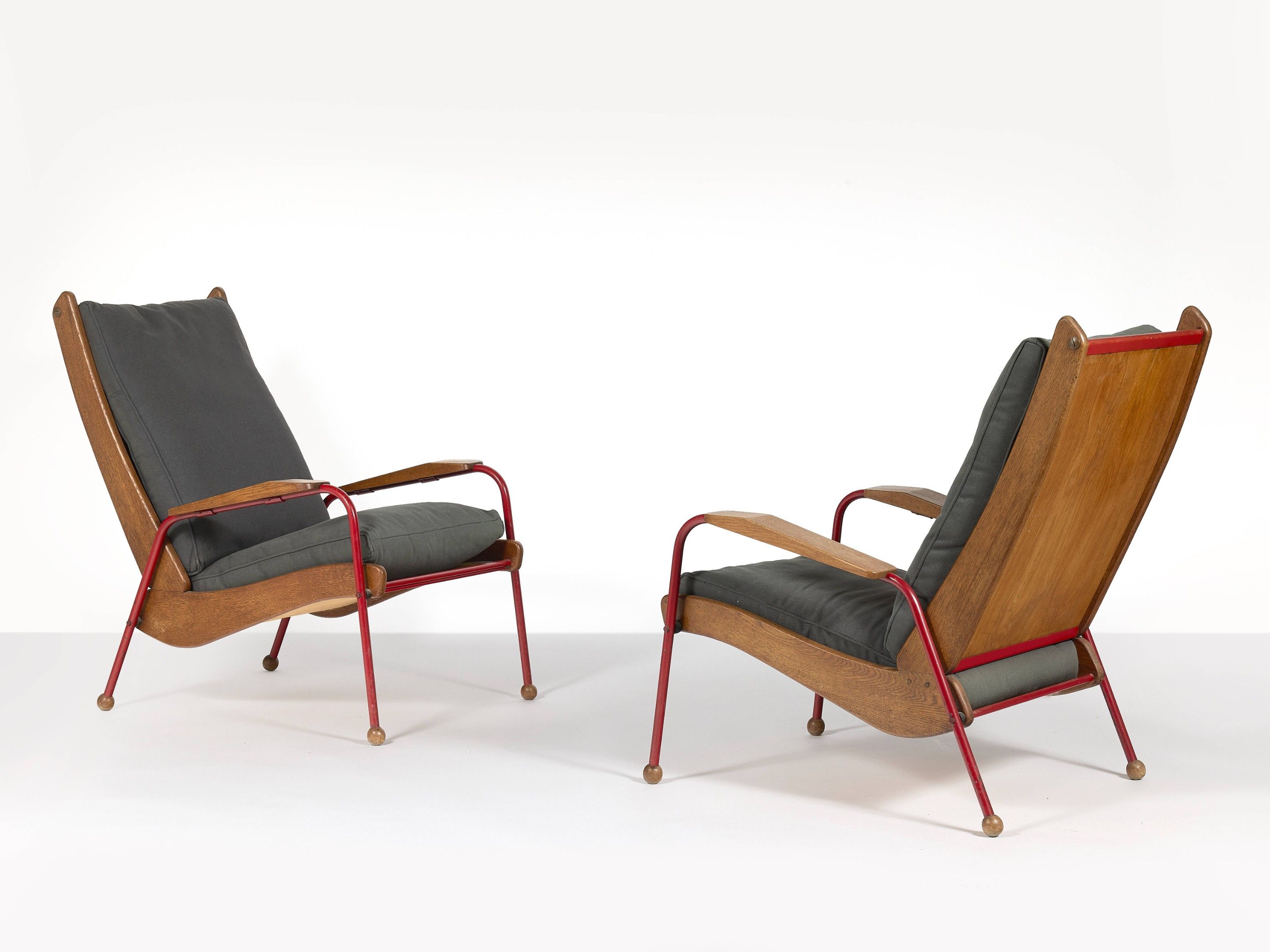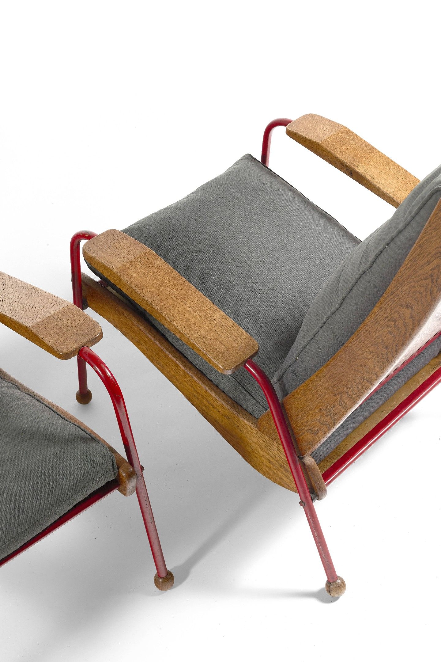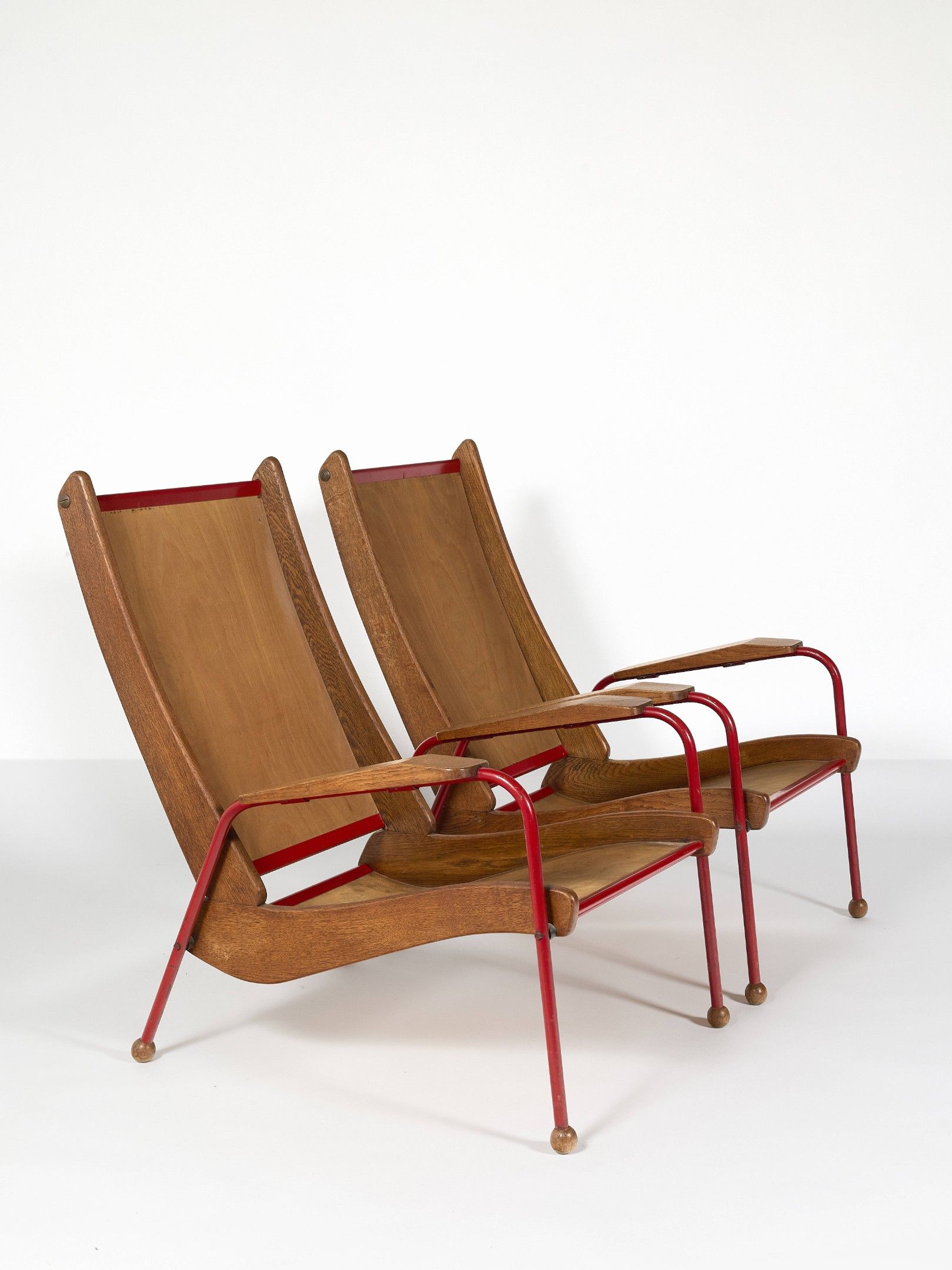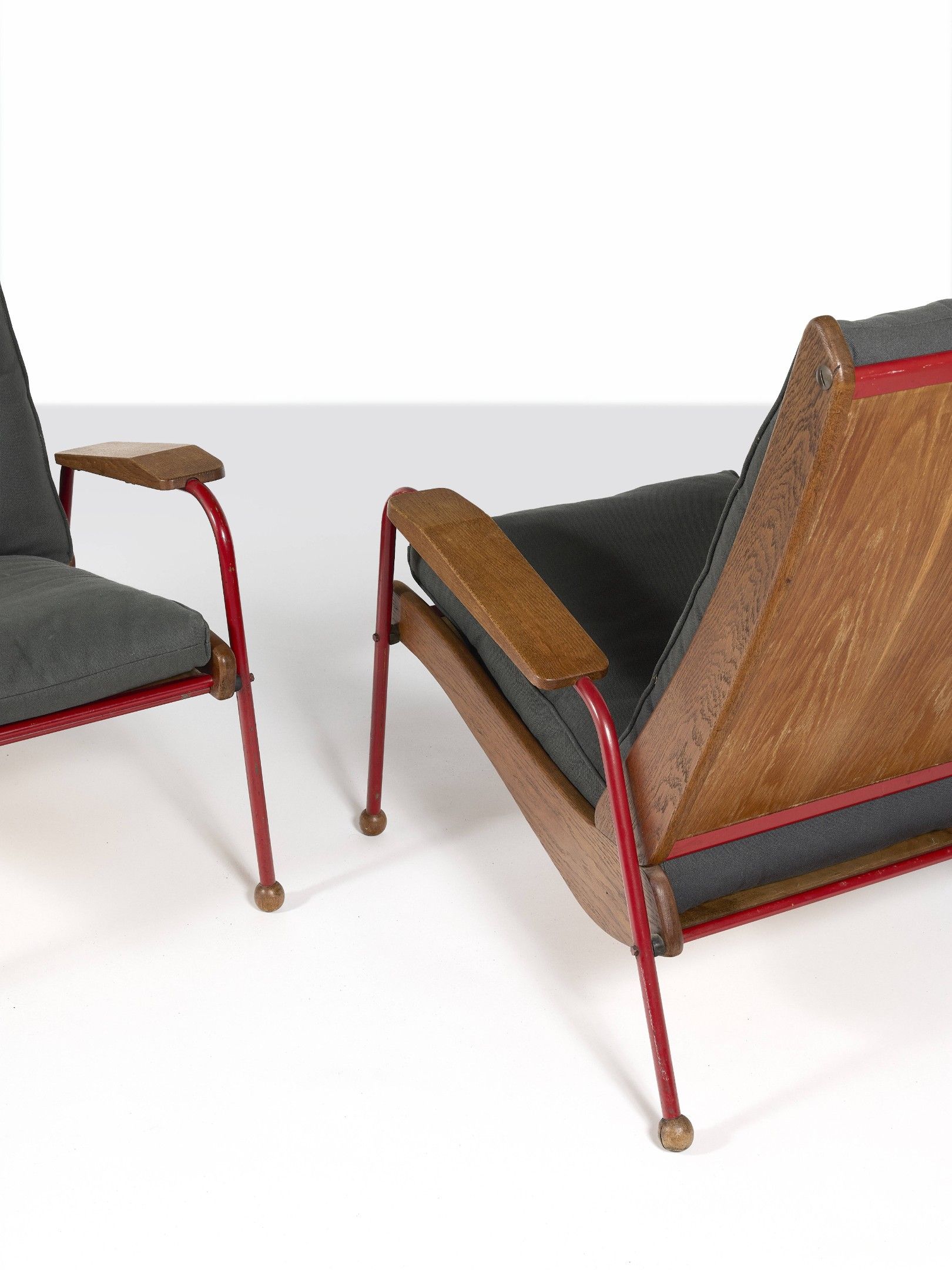 A “rouge Corsaire” painted steel, oak, plywood and rubber “Visiteur F.V.13.” pair of armchairs by Jean Prouvé