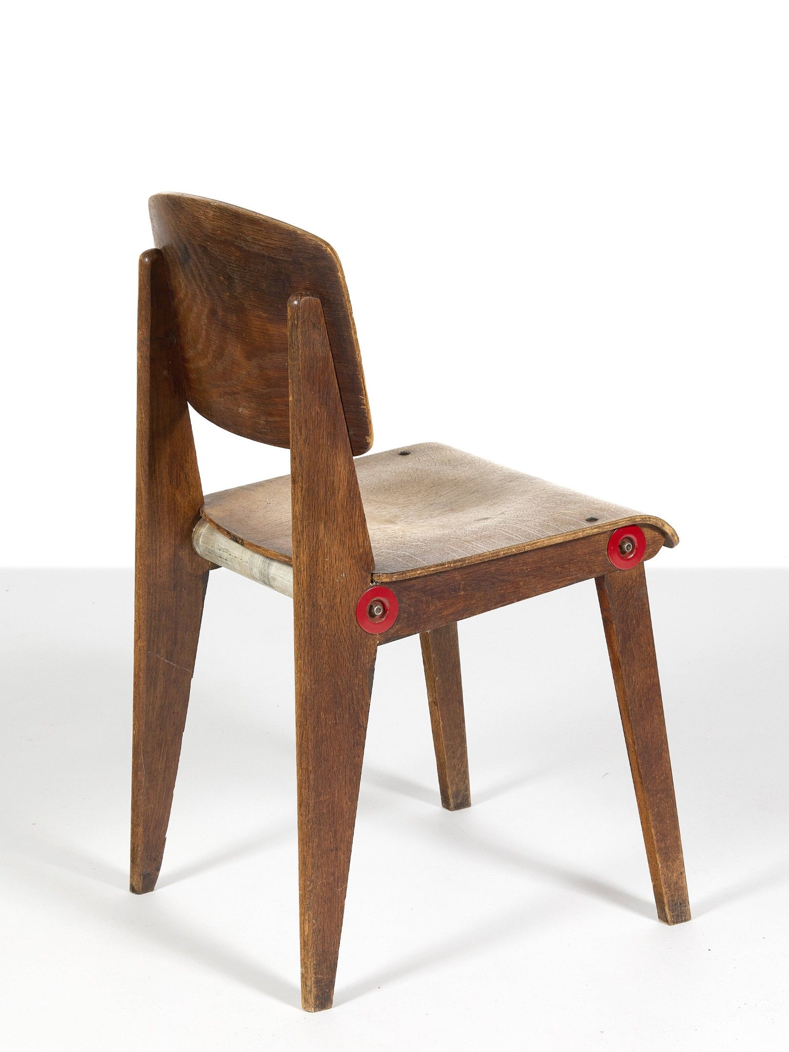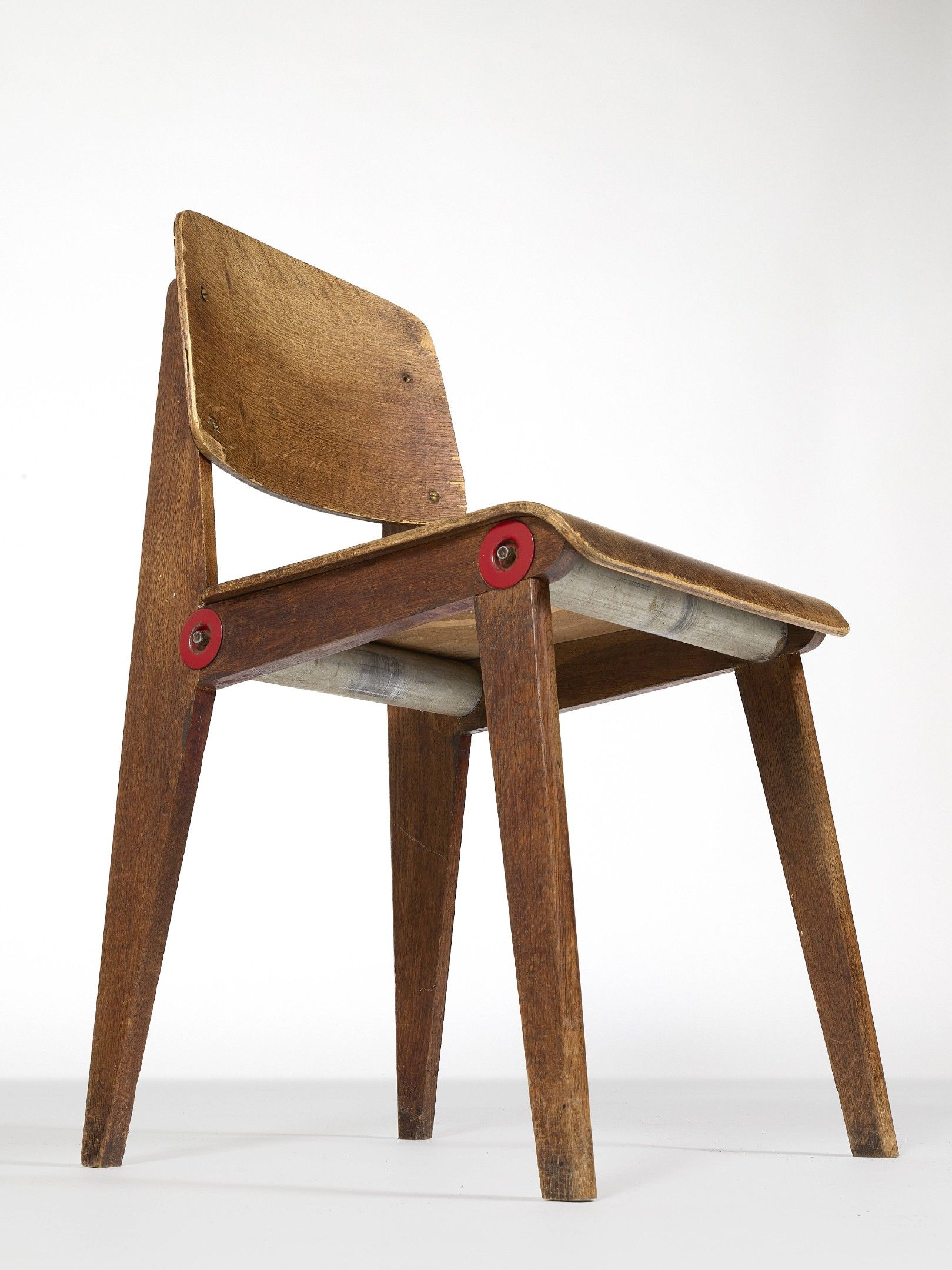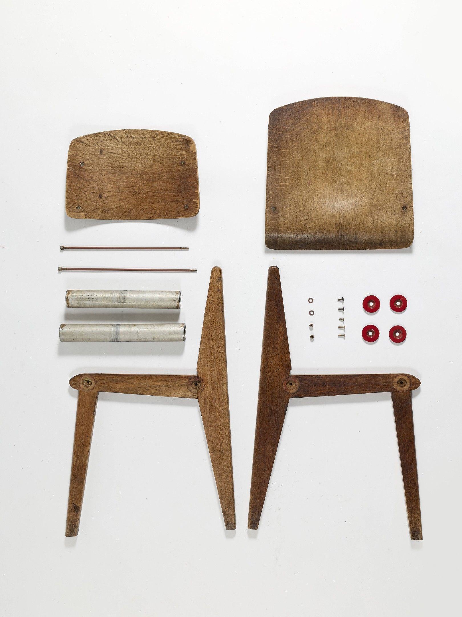 An oak, plywood, aluminum and “rouge Corsaire” painted steel “CB22” dismountable chair by Jean Prouvé