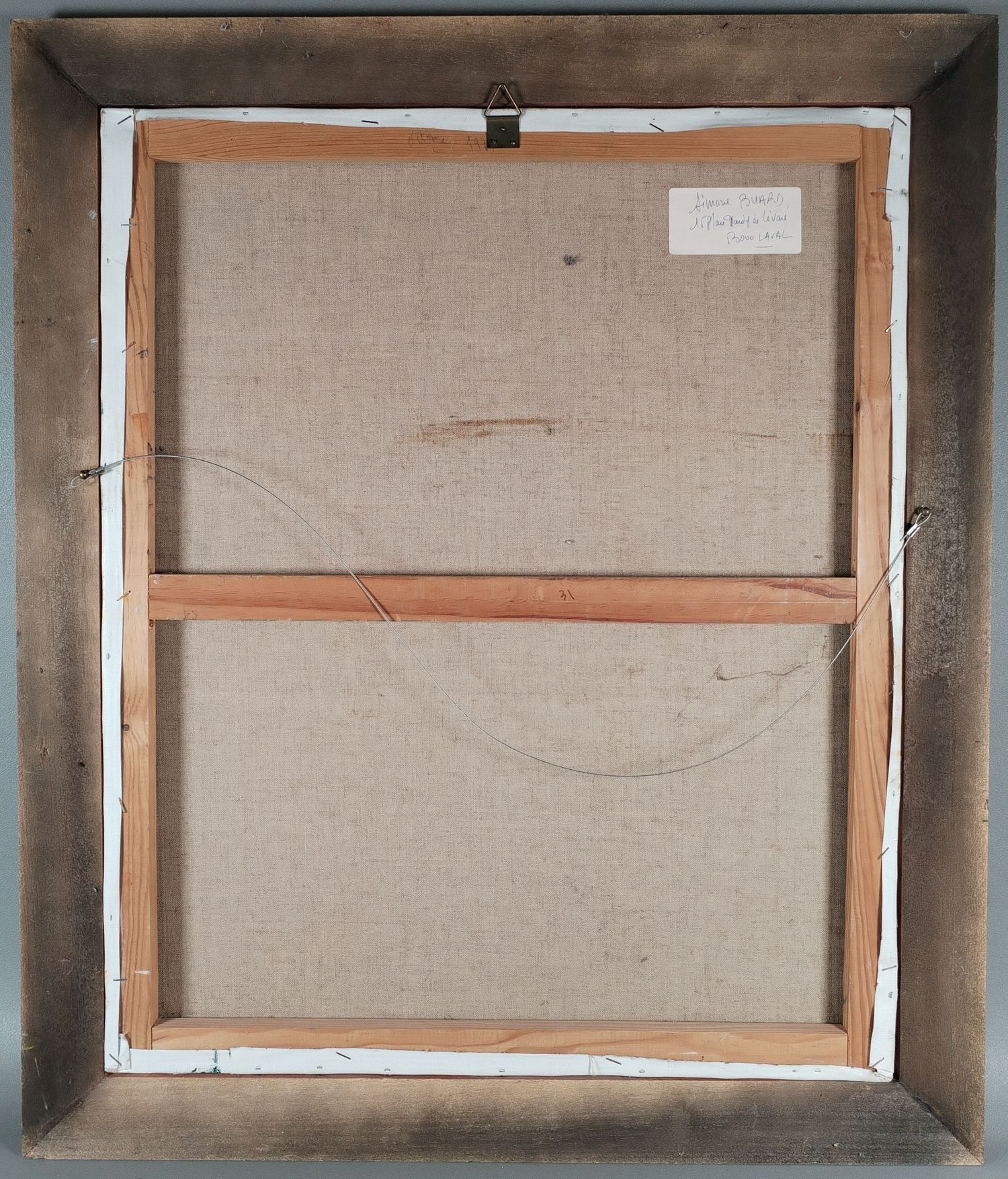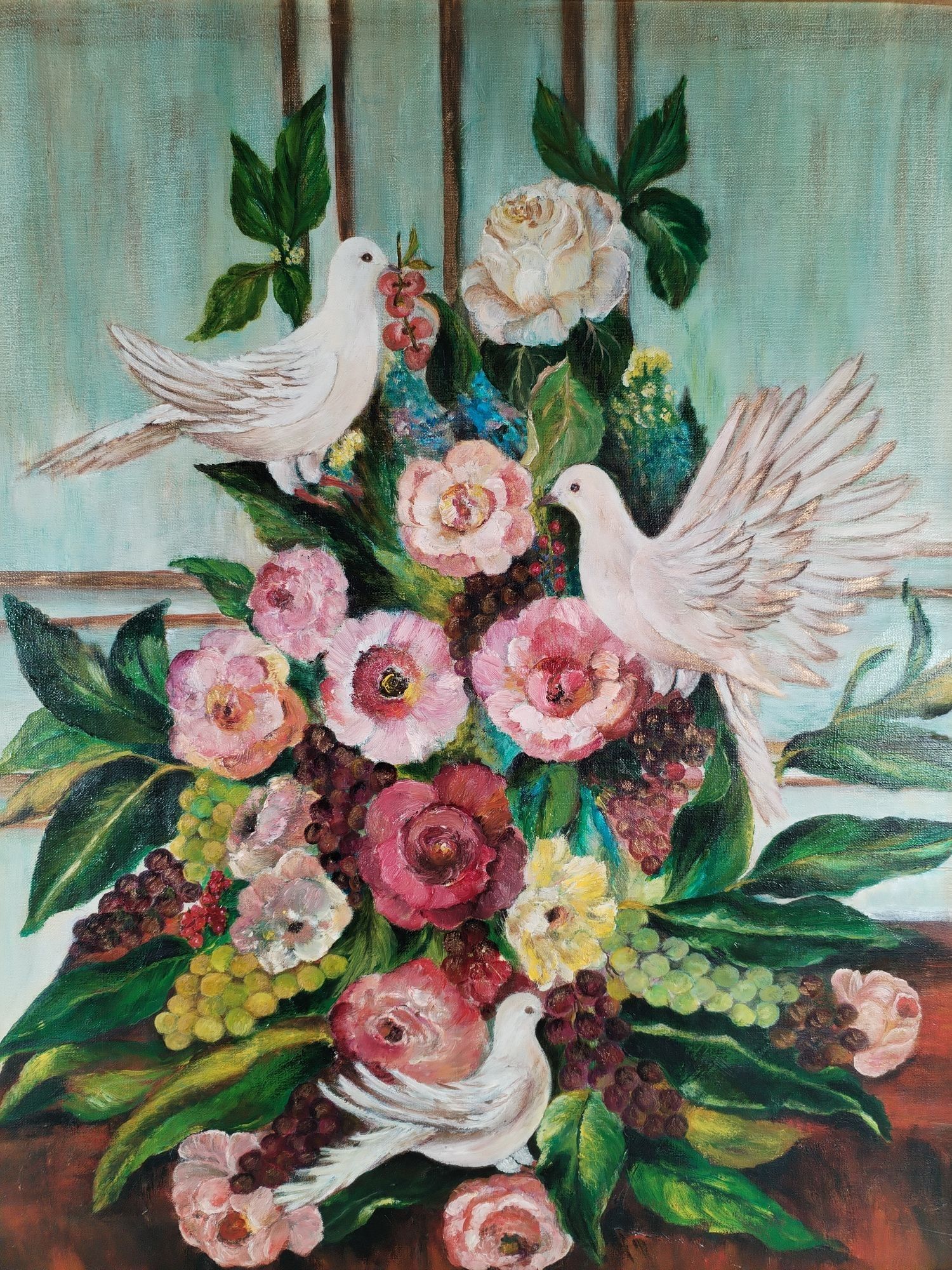 Simone BUHARD HST "3 colombes et fleurs" Dim : 80 x 60 cm Ni S, ni D Étiquette au dos et sur chassis « octobre 198.. »
