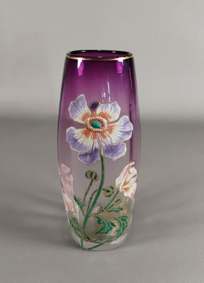 Vase fuseau en verre teinté violet à décor émaillé de clémat…