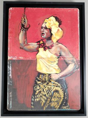 JAC ? "Femme en jaune avec un turban jaune" Huile sur carton…