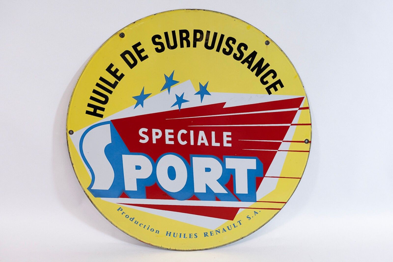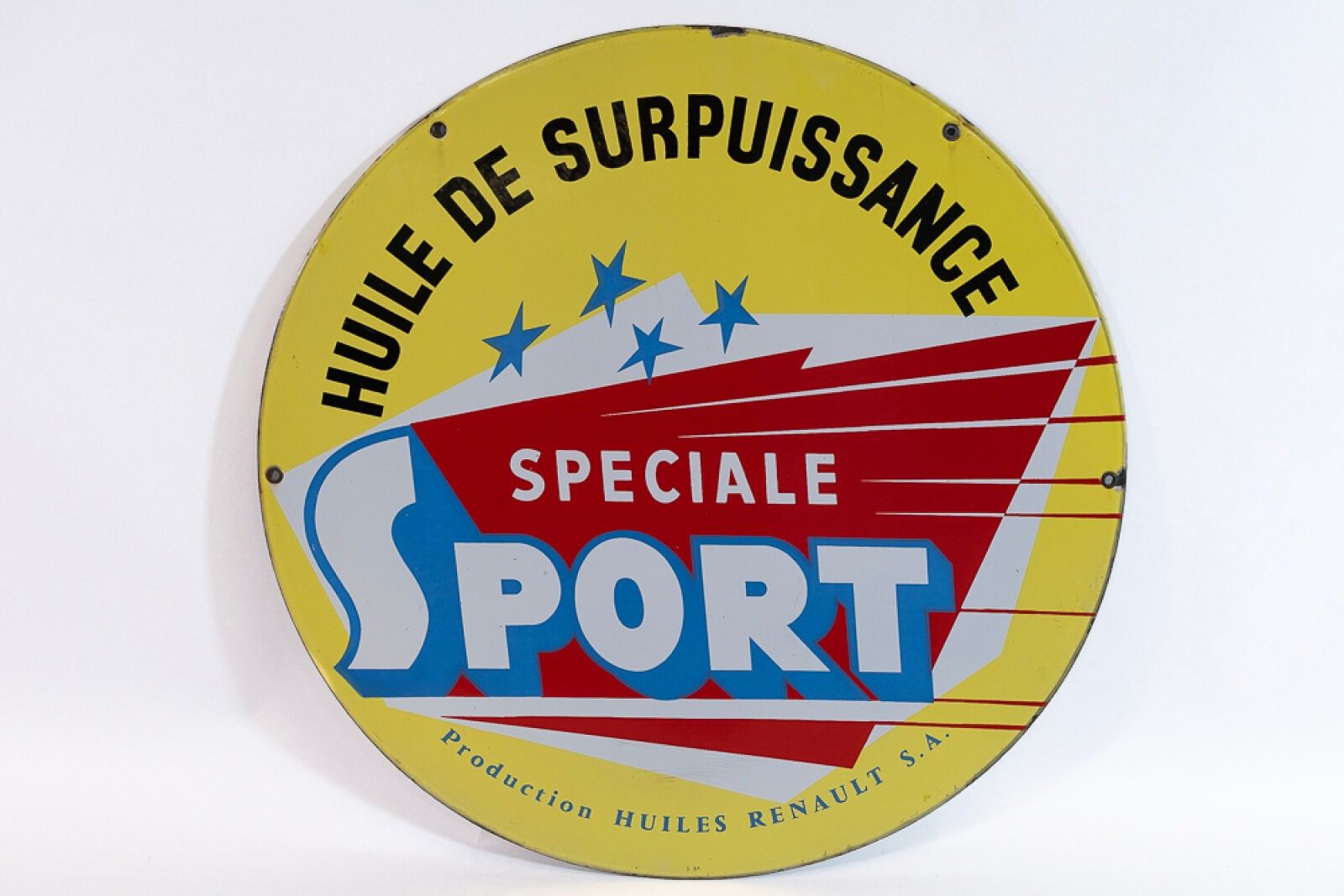 Premium HUILES RENAULT SPÉCIALE SPORT - vers 1950, fond jaune . Plaq…