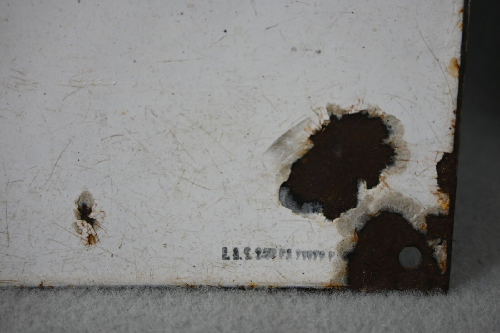 ESSO, Plaque publicitaire en tôle émaillée de forme rectangulaire. Email Ed Jean 1934. Éclats, rayures. Dimensions : 80 x 100 cm