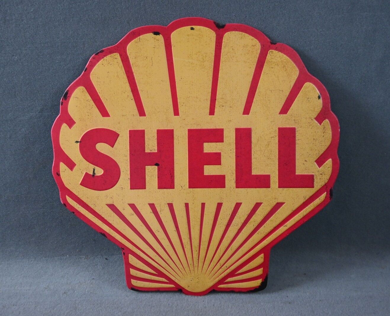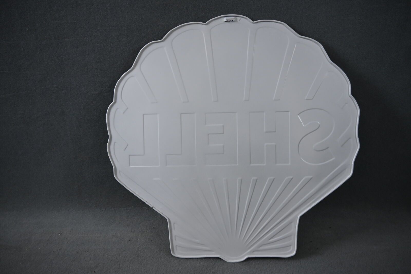 SHELL. Plaque publicitaire en tôle lithographiée en découpe, légèrement embossée, figurant une coquille. Édition moderne. Dimensions : 61 x 62 cm