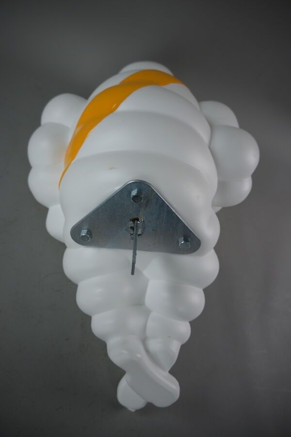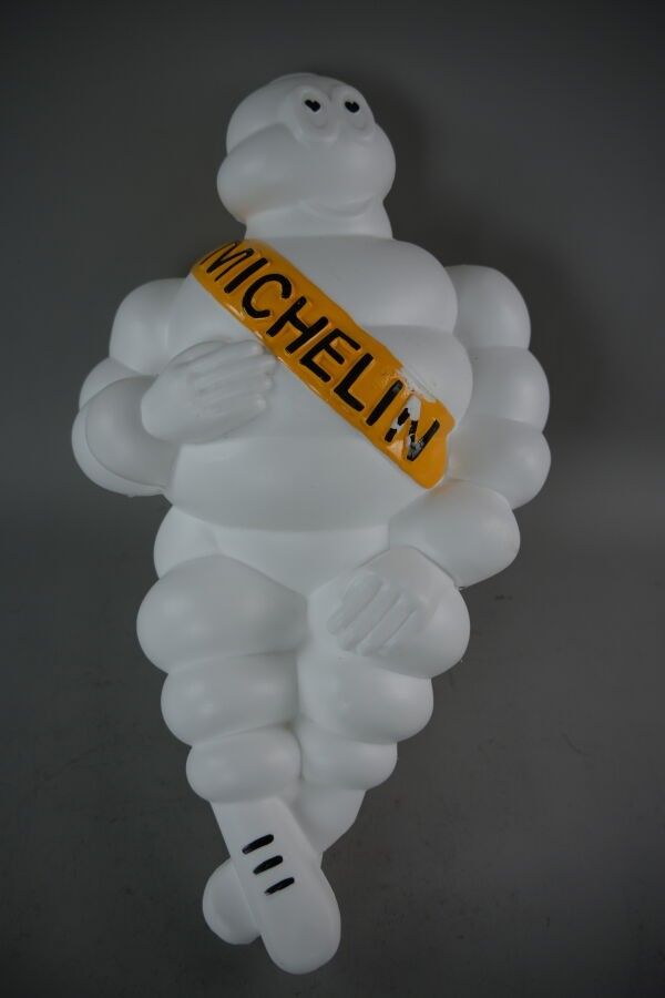 MICHELIN, Sujet Bibendum de camion, en position assise, en plastique moulé. Édition moderne. Manques à la peinture de l'écharpe. Dimensions : h. 45 cm