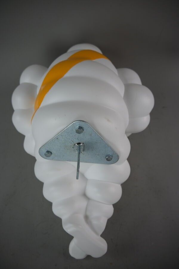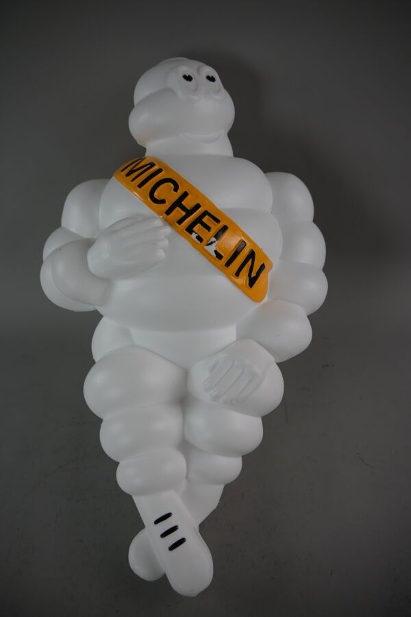 MICHELIN, Sujet Bibendum de camion, en position assise, en plastique moulé. Édition moderne. Manques à la peinture de l'écharpe. Dimensions : h. 45 cm