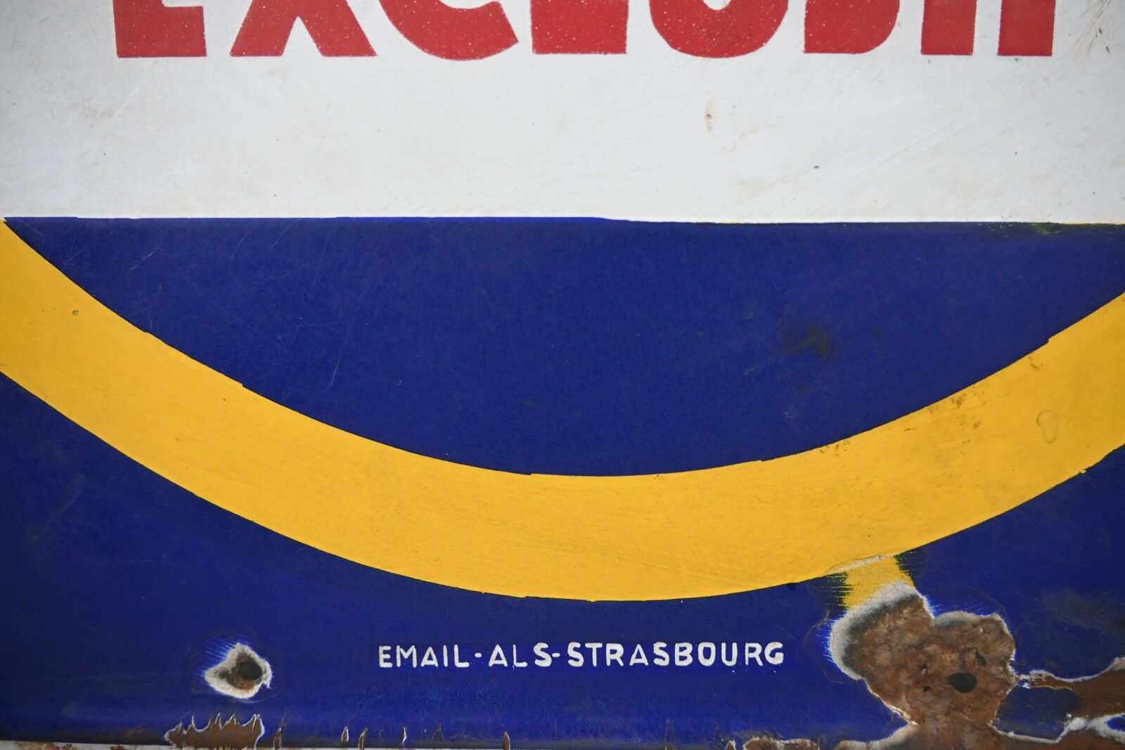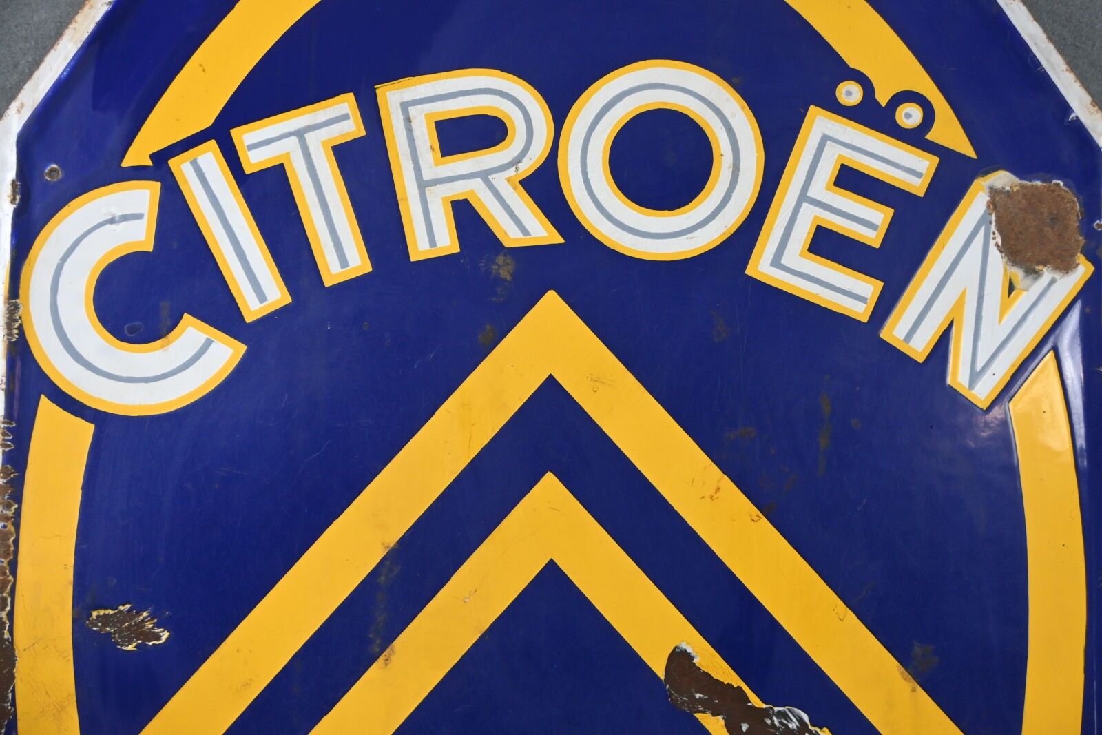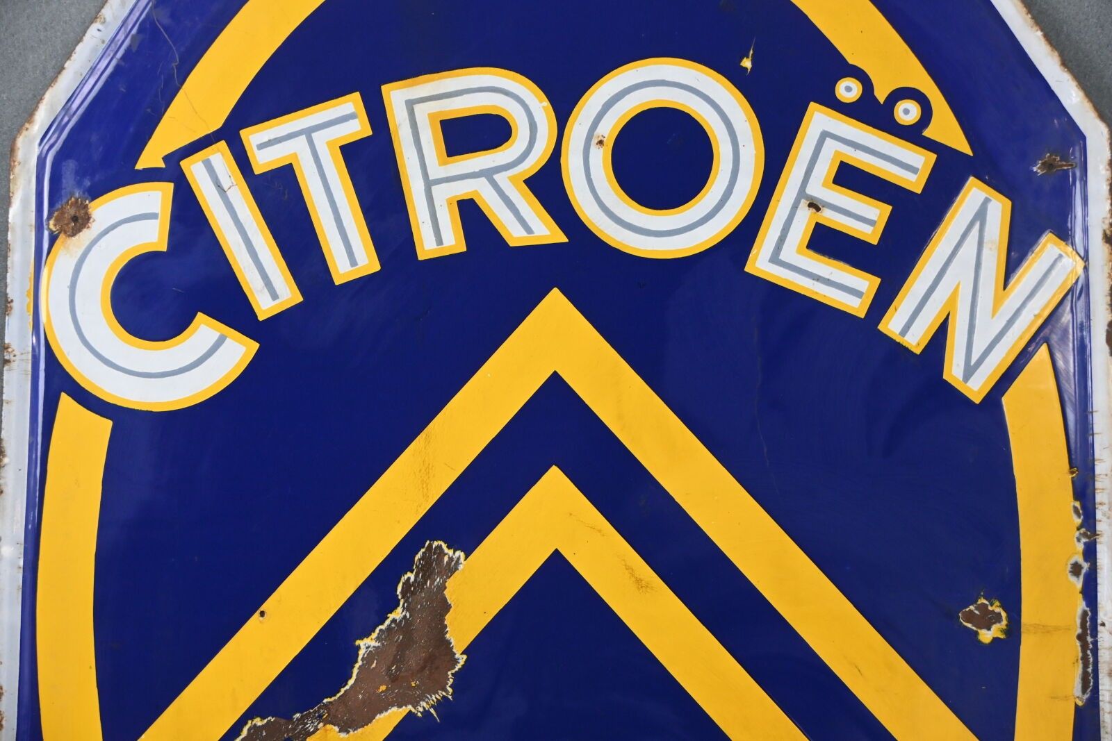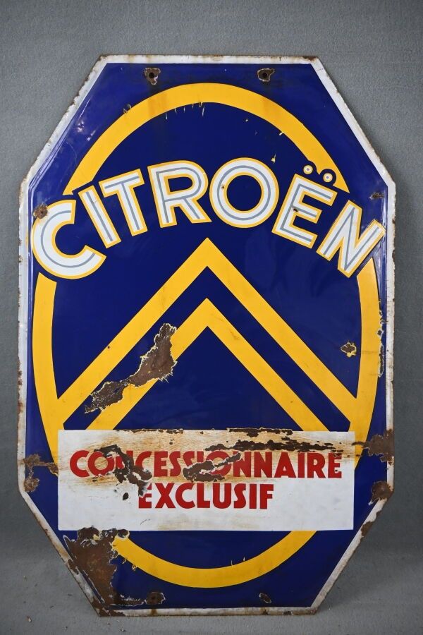 CITROEN Concessionnaire Exclusif. Plaque publicitaire en tôle émaillée de forme octogonale double face, chanfreinée. Emaillerie Alsacienne Strasbourg. Importants manques, perforations, oxydation, déformations. Dimensions : 110,5 x 75 cm.
