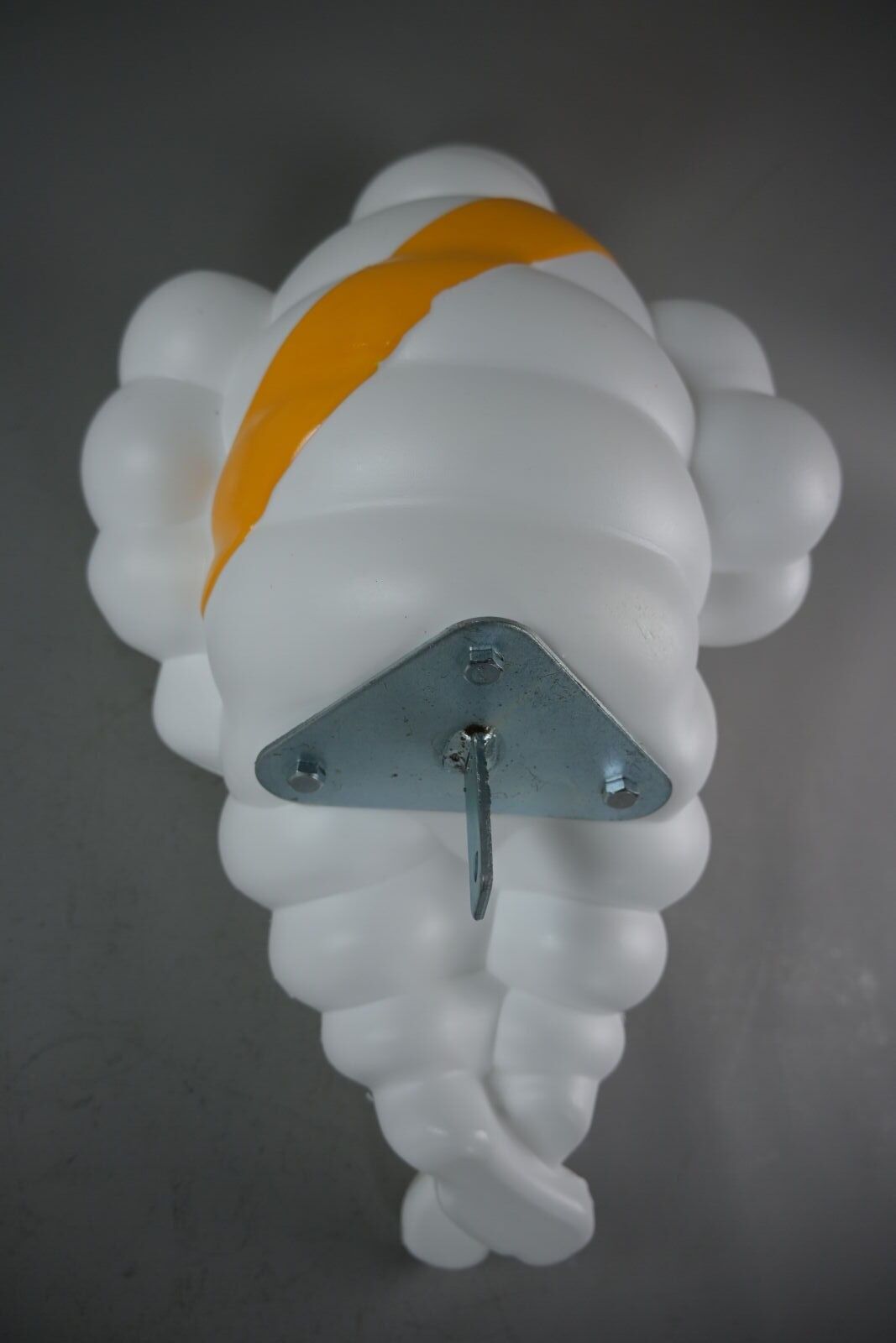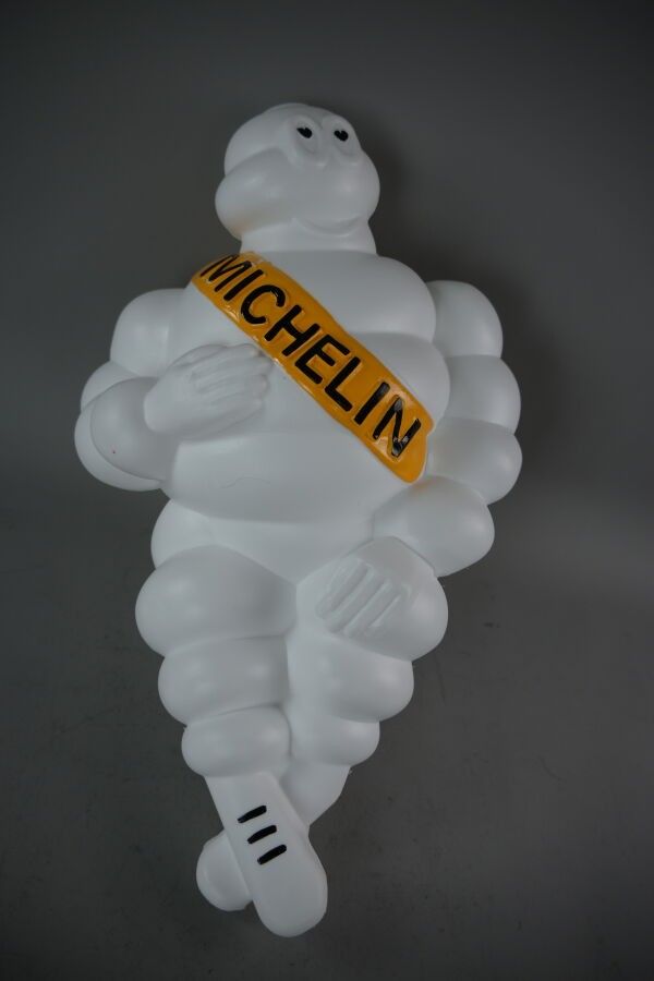 MICHELIN, Sujet Bibendum de camion, en position assise, en plastique moulé. Édition moderne. Manques à la peinture de l'écharpe. Dimensions : h. 45 cm