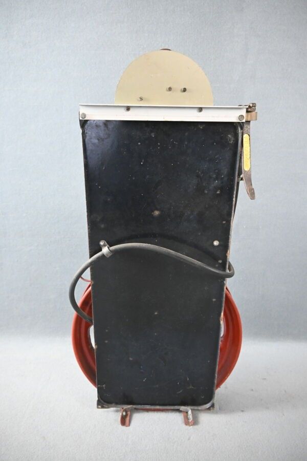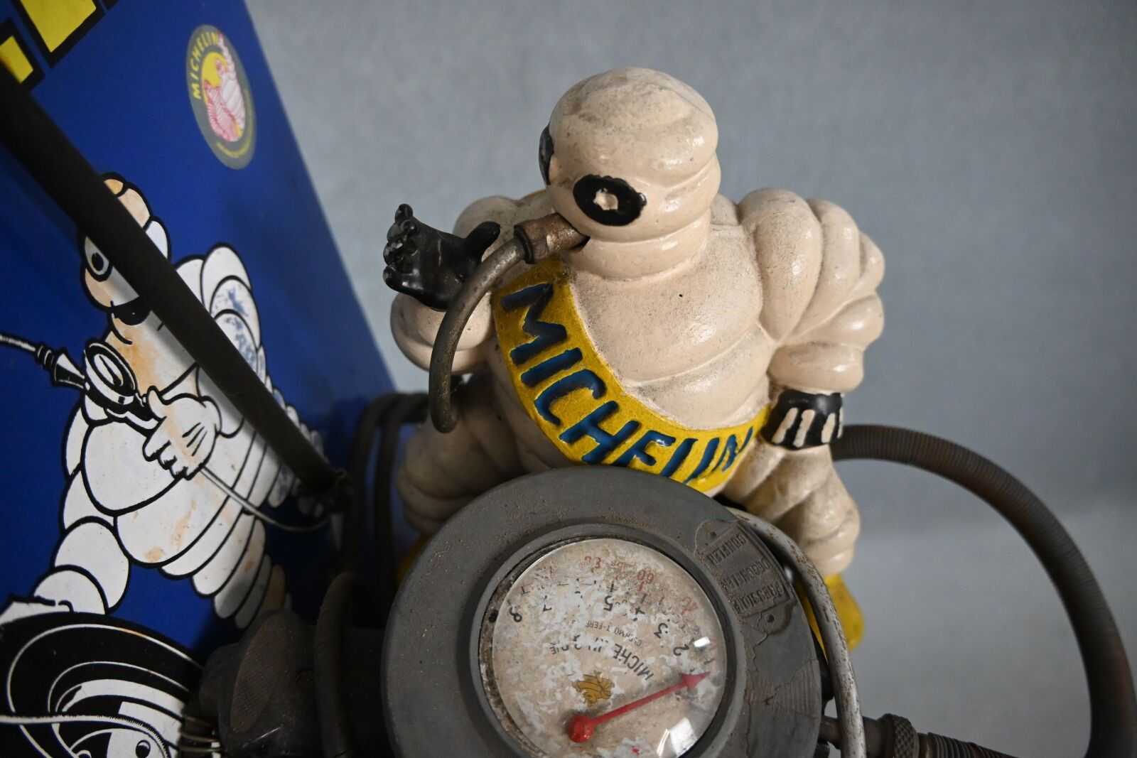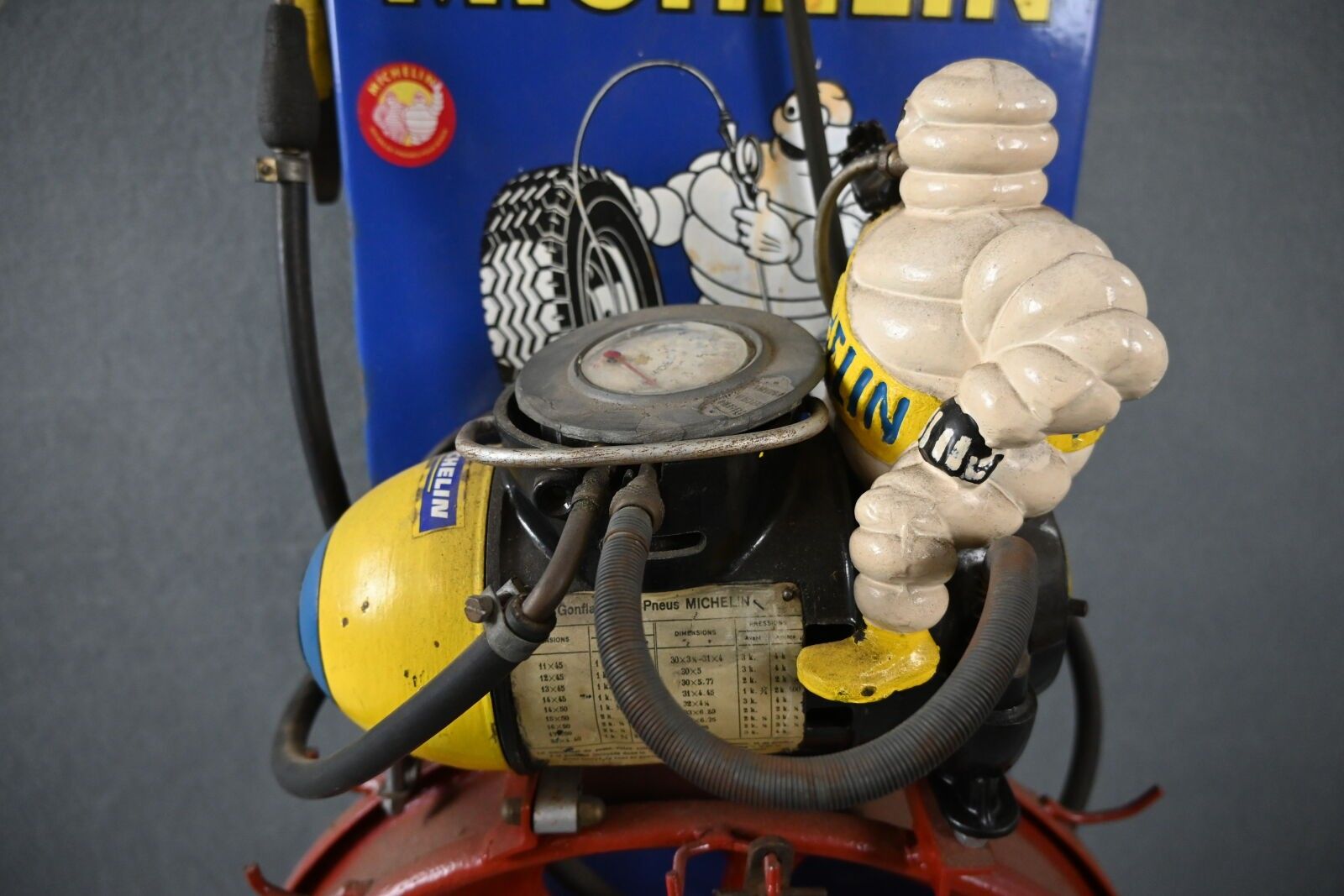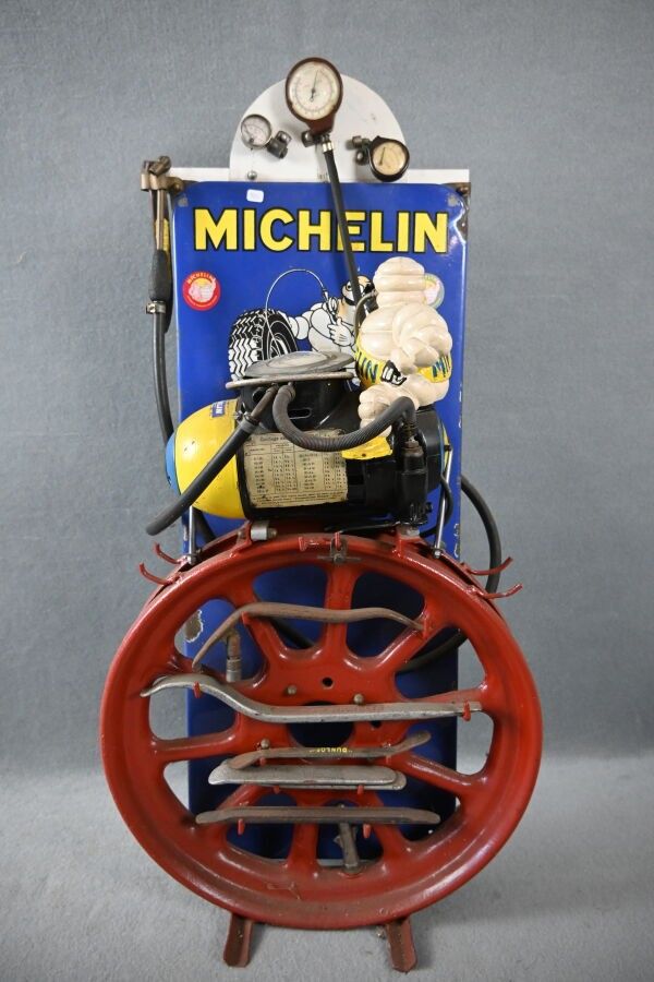 MICHELIN, Gonfleur portatif surmonté du bibendum en fonte. Repeint. Monté sur un présentoir avec plaque Michelin en tôle émaillée rembordée à oreilles (80 x 34 cm) et roue avec outil démonte pneu. Non testé