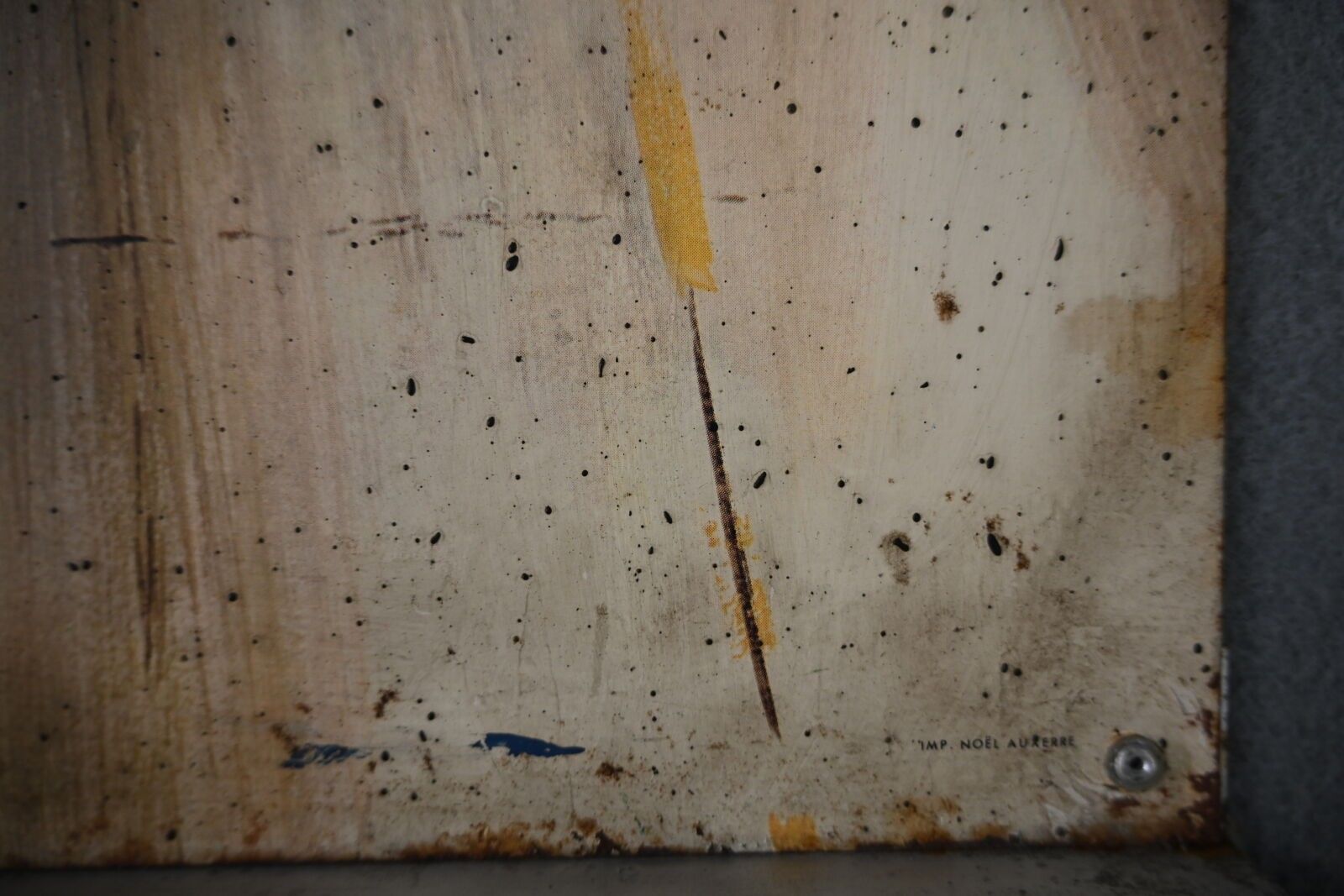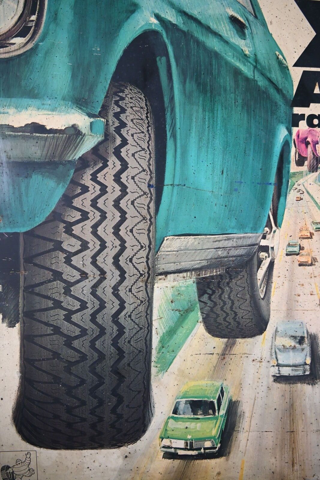 MICHELIN XAS RADIAL, Plaque publicitaire en tôle lithographiée illustrée d'un pneu de la marque. Imp. Noël Auxerre. Rayures, perforations, oxydation, déformations. Montée sur deux profilés alu. Dimensions : 80 x 60 cm