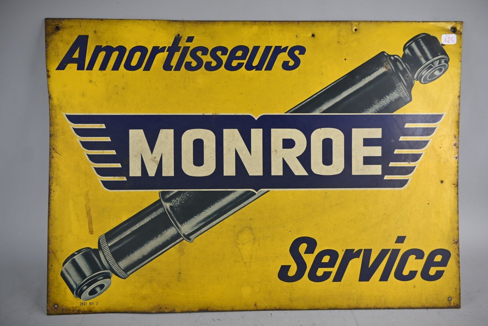MONROE Amortisseurs. Plaque publicitaire en tôle lithographiée de forme rectangulaire illustrée d'un amortisseur de la marque. Rayures, perforations, oxydation. Dimensions : 35 x 50 cm.