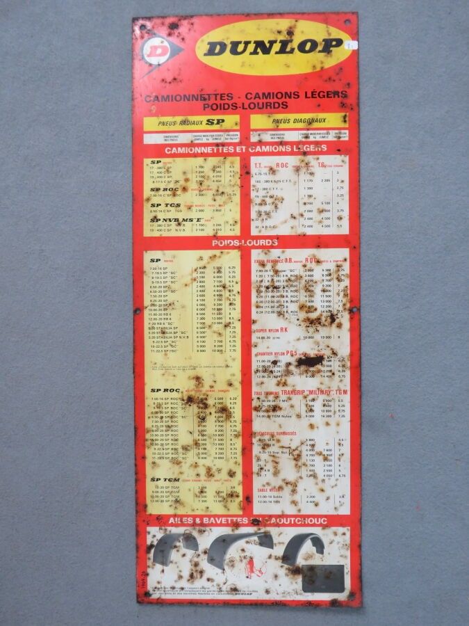 DUNLOP, Plaque publicitaire de gonflage des pneus camionnettes, camions légers, poids-lourds 1969, en tôle lithographiée. Rayures, oxydation, déformations, manques. Dimensions : 82,5 x 31,5 cm