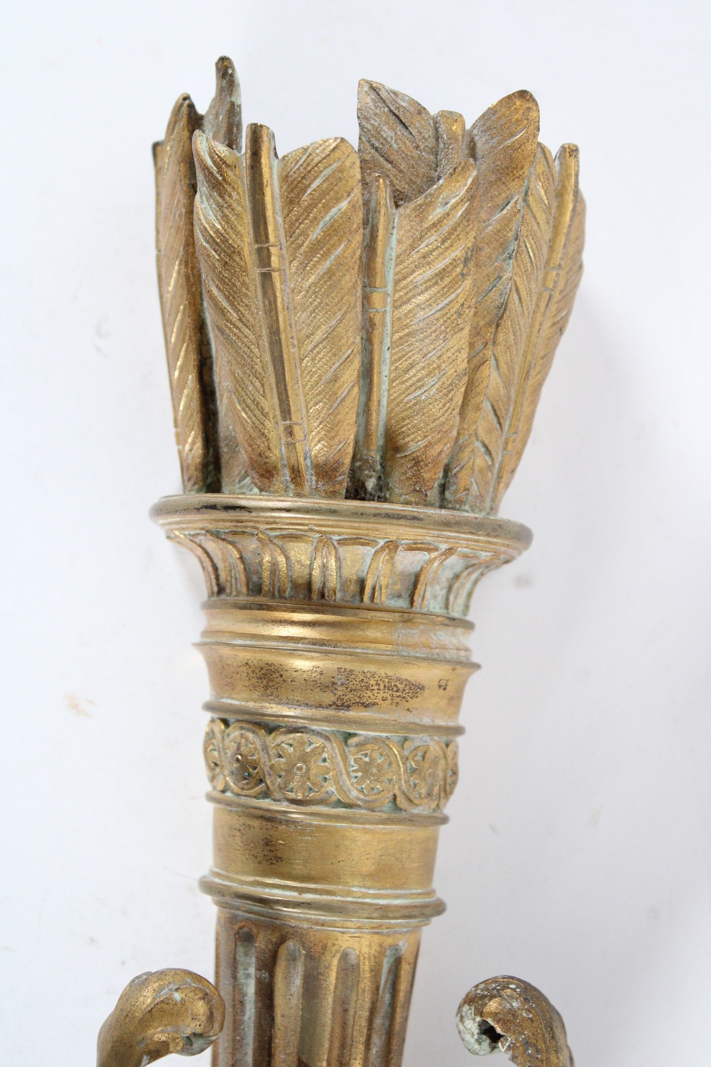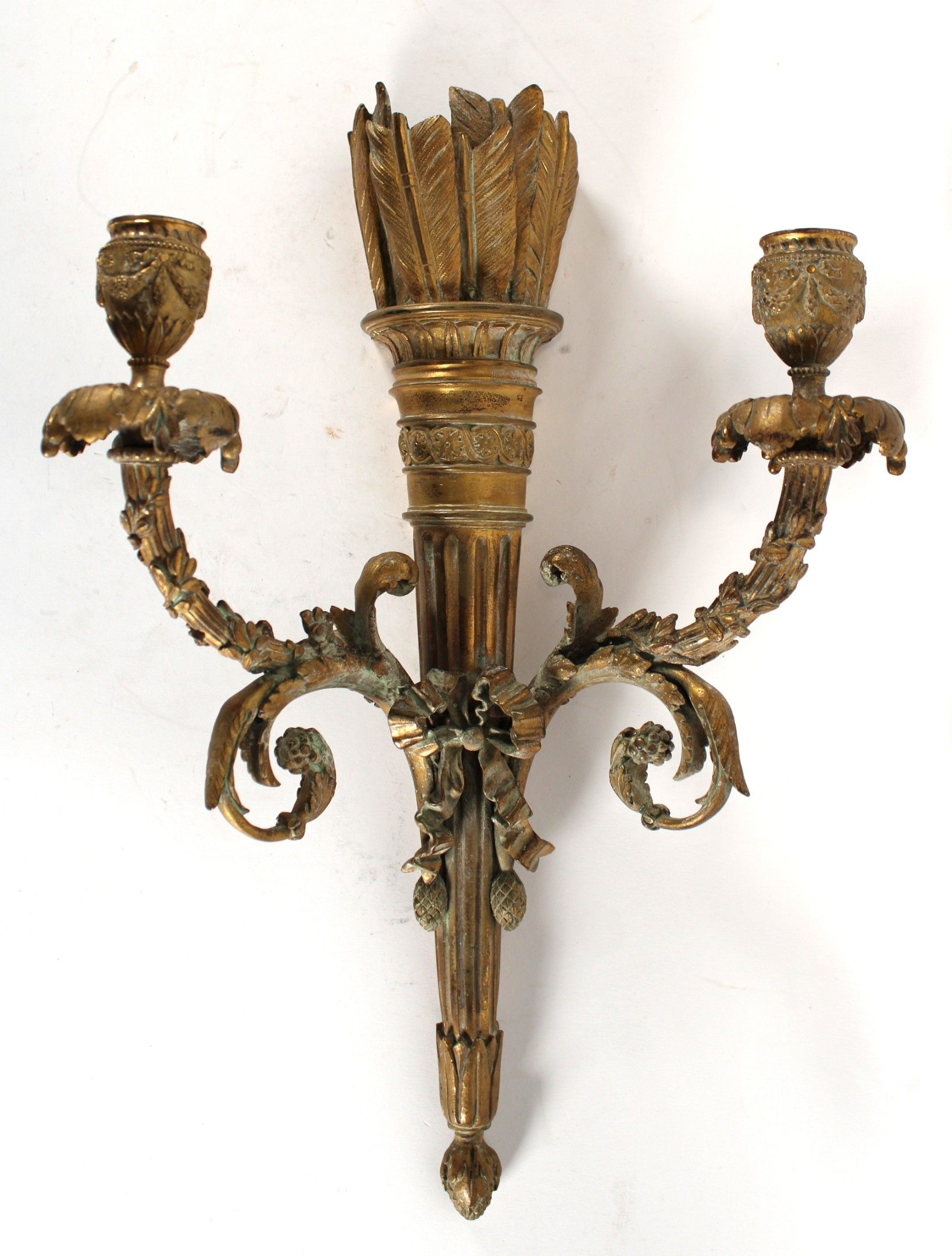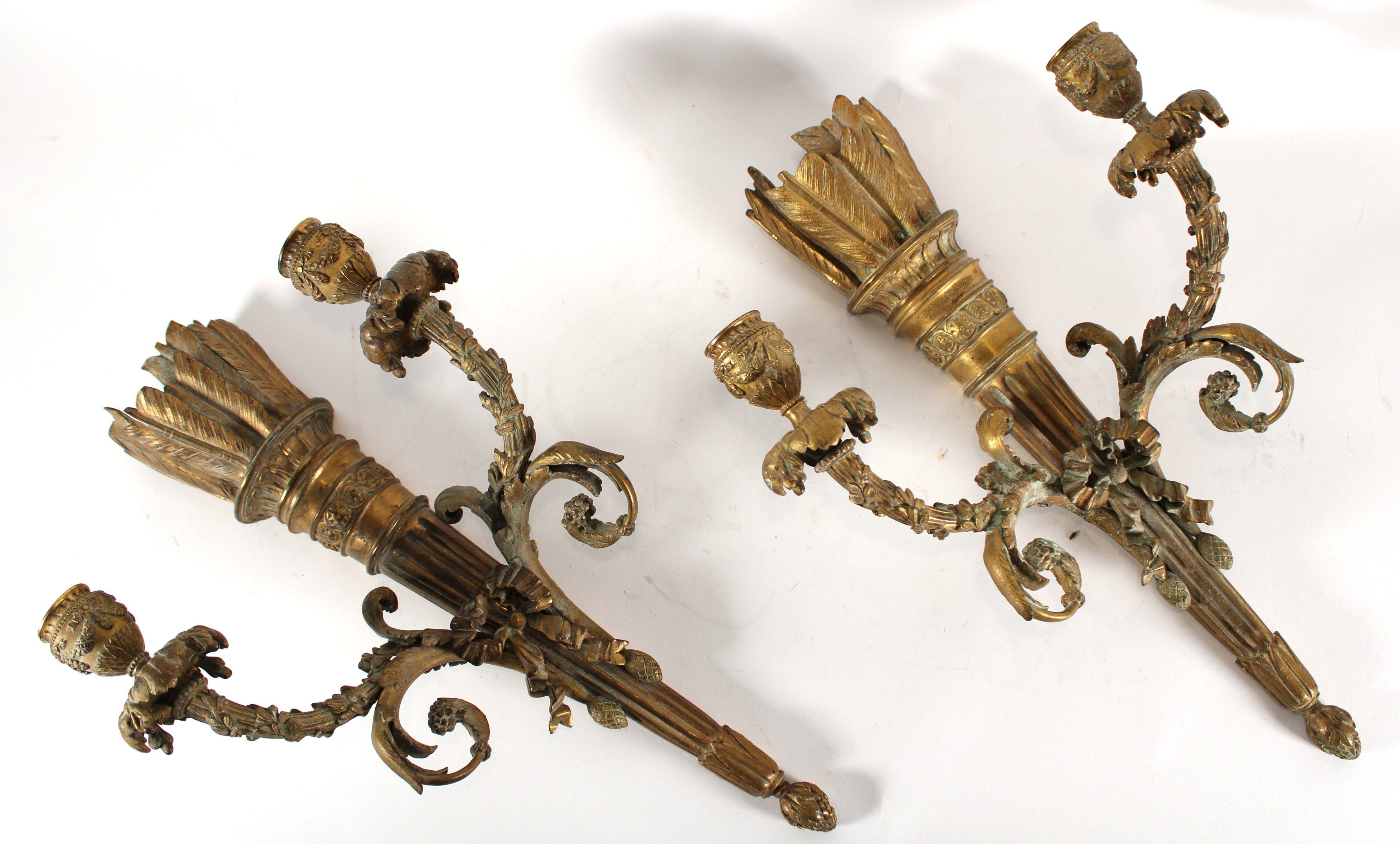 Paire d'appliques à deux bras de lumière en bronze ciselé et doré à décor d'un carquois souligné d'un nœud et se terminant par une pomme de pin.