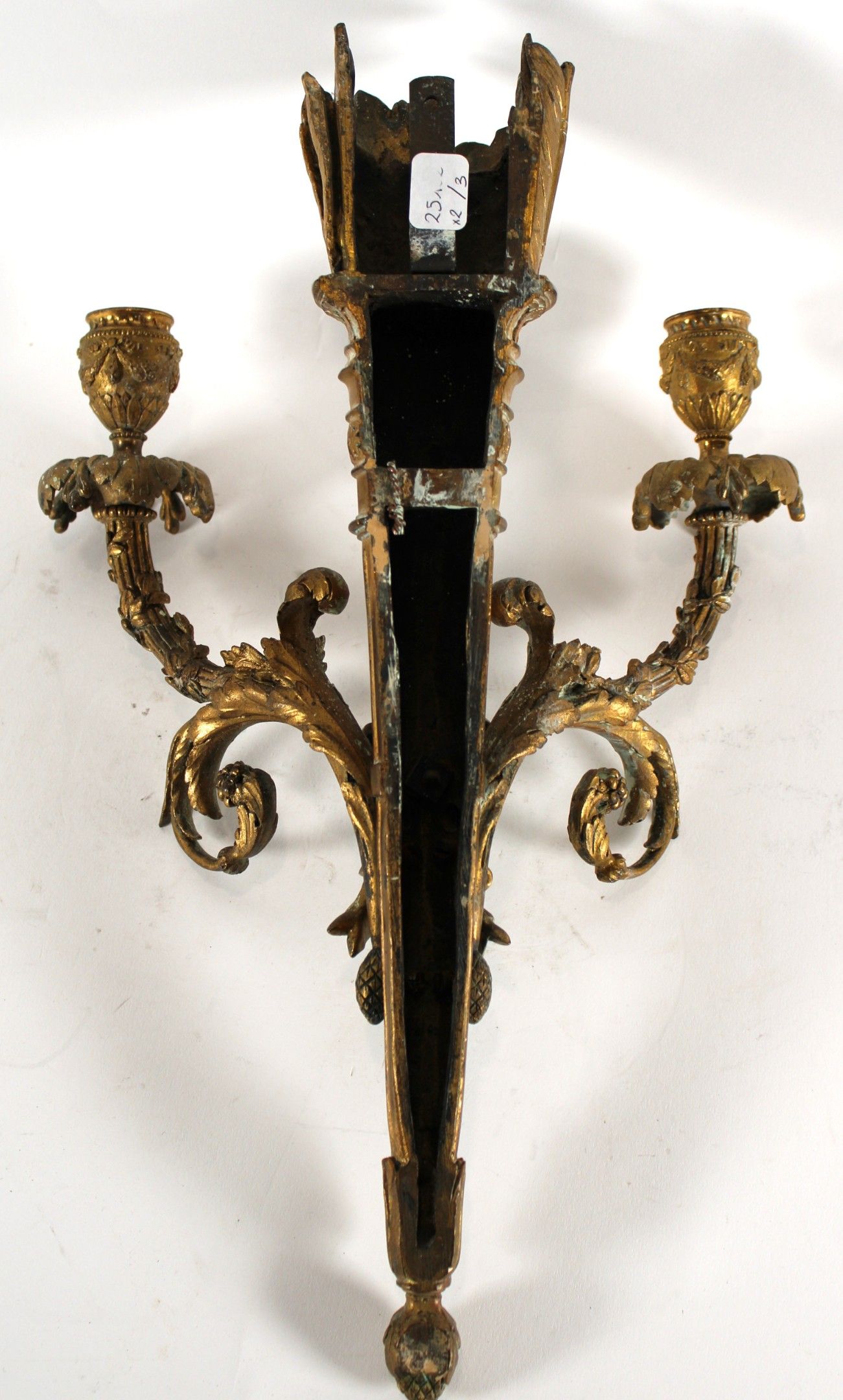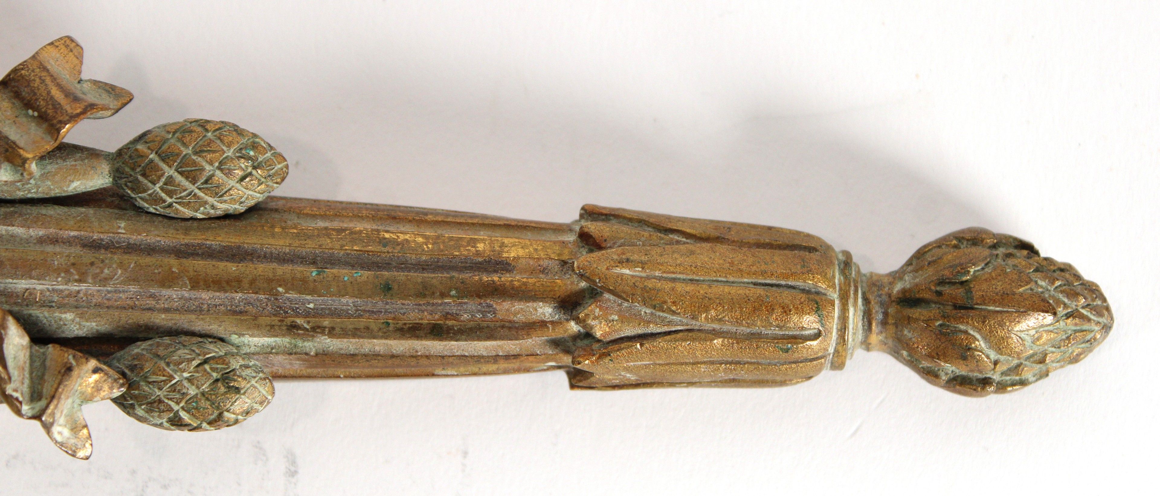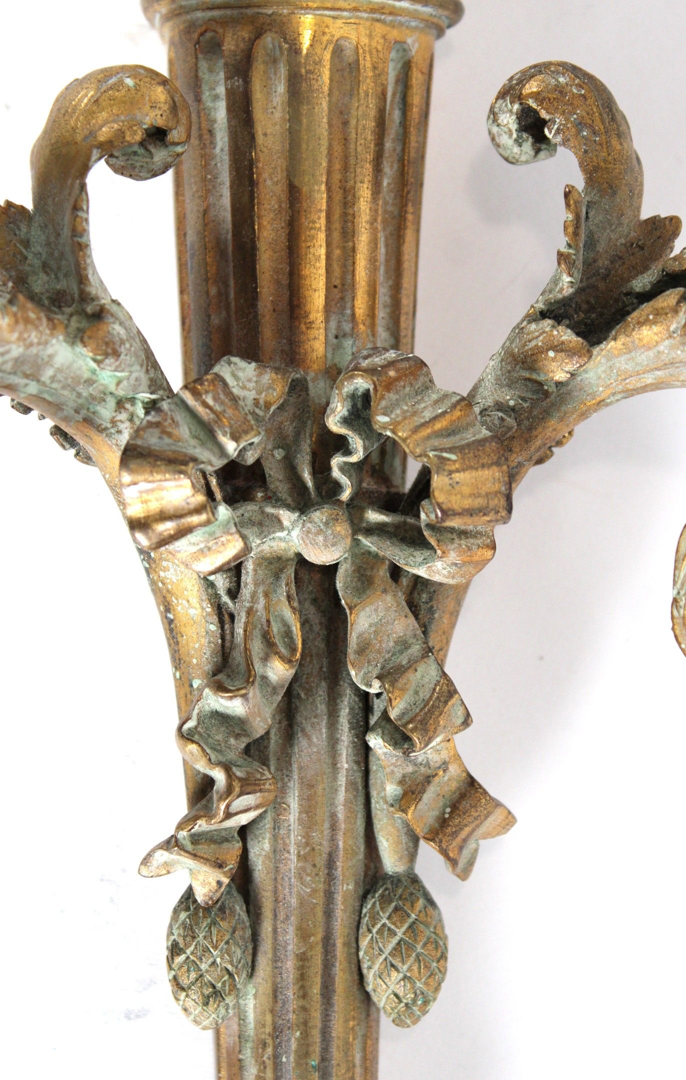 Paire d'appliques à deux bras de lumière en bronze ciselé et doré à décor d'un carquois souligné d'un nœud et se terminant par une pomme de pin.