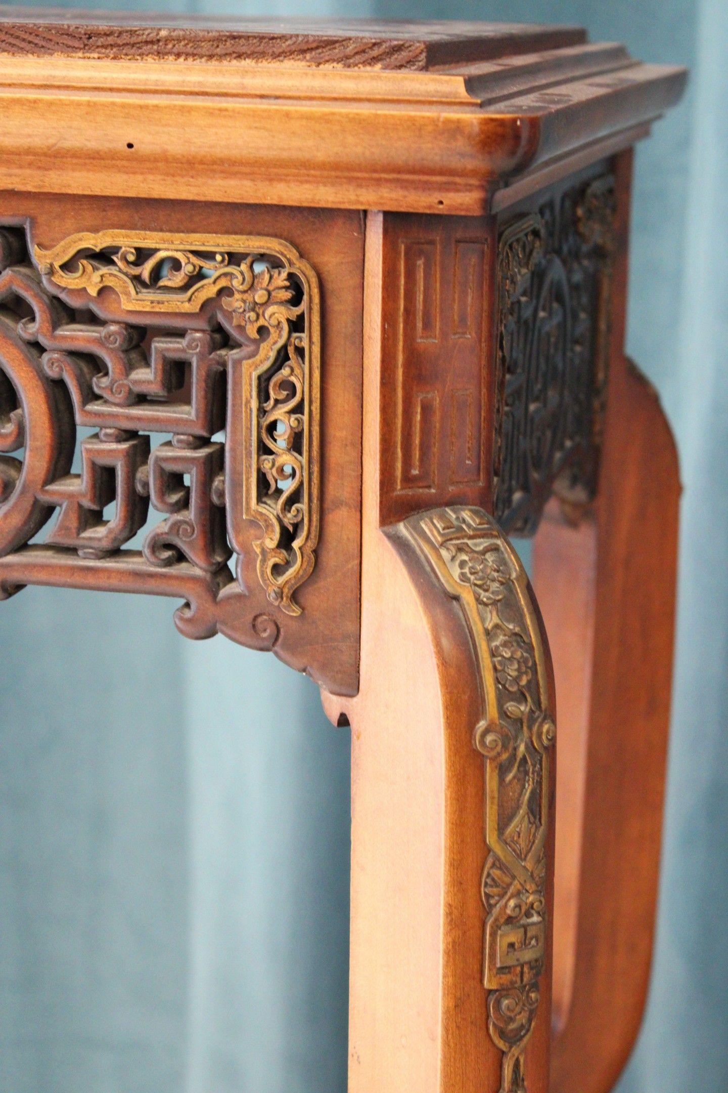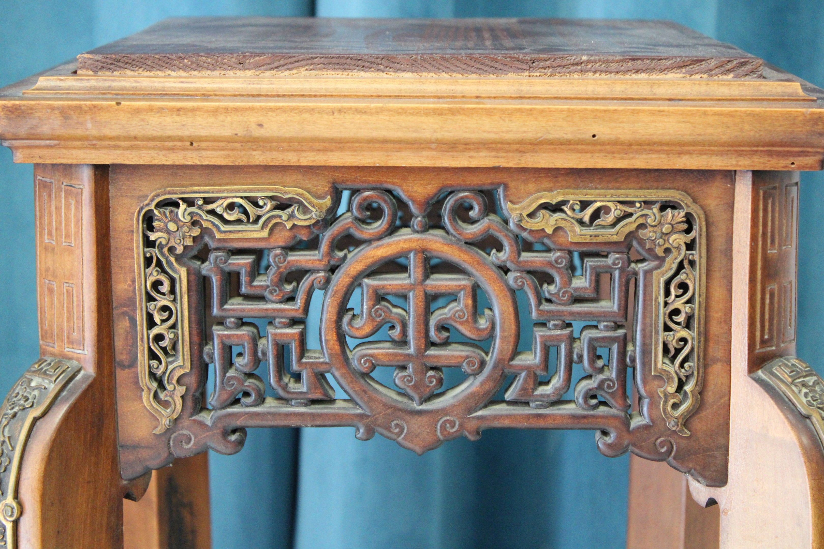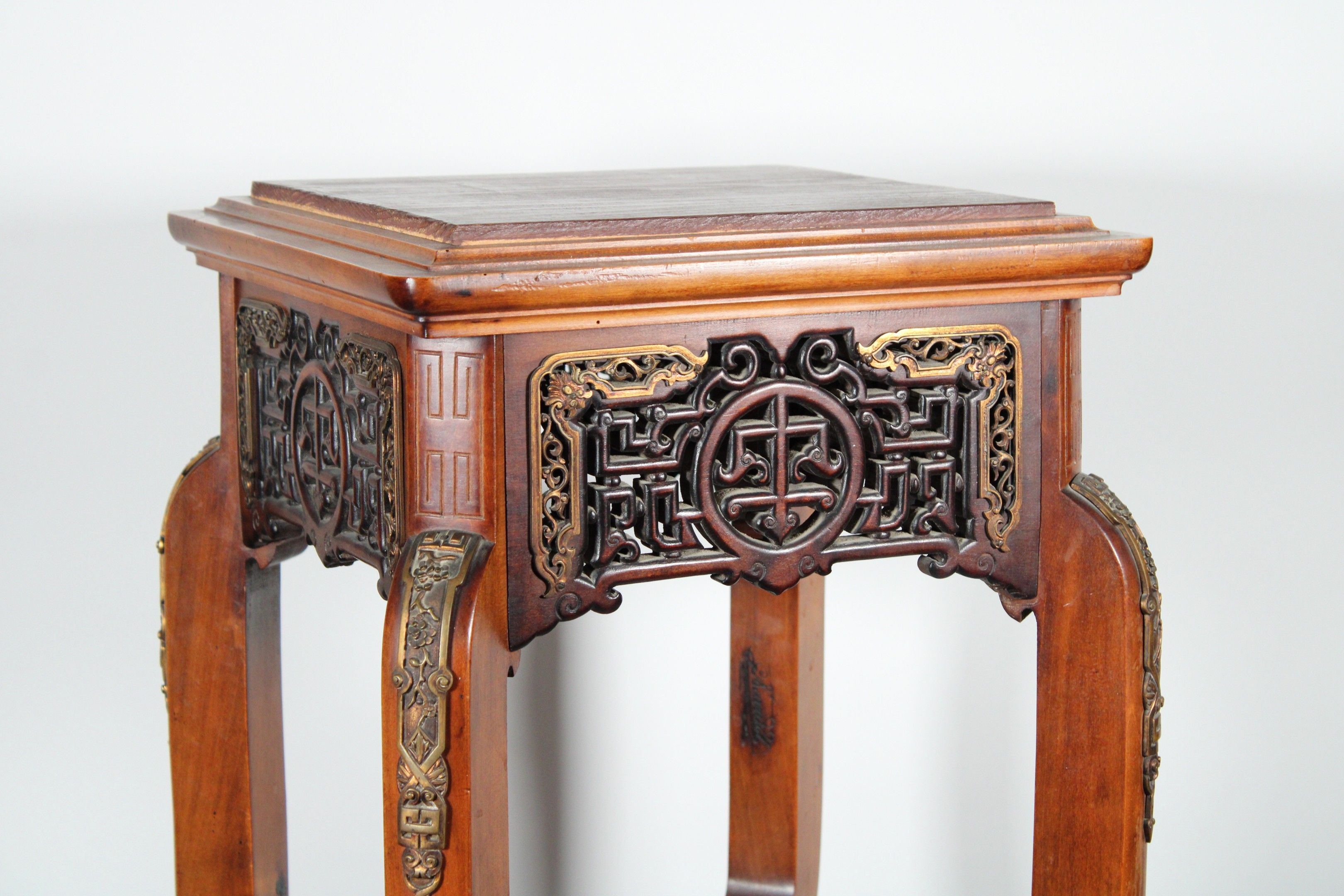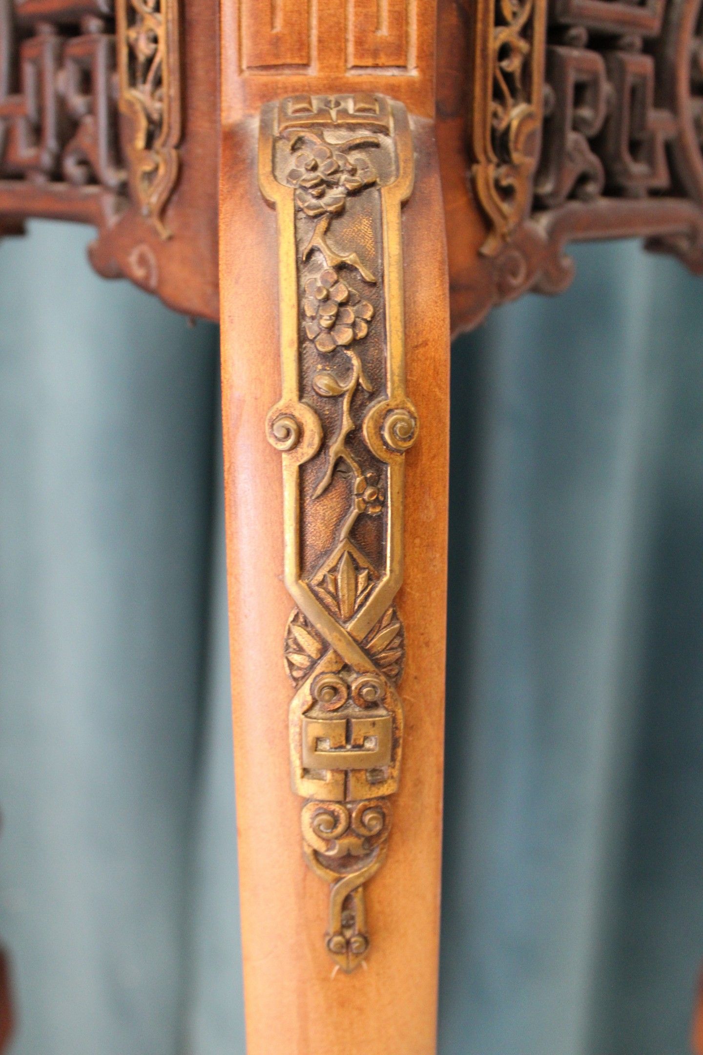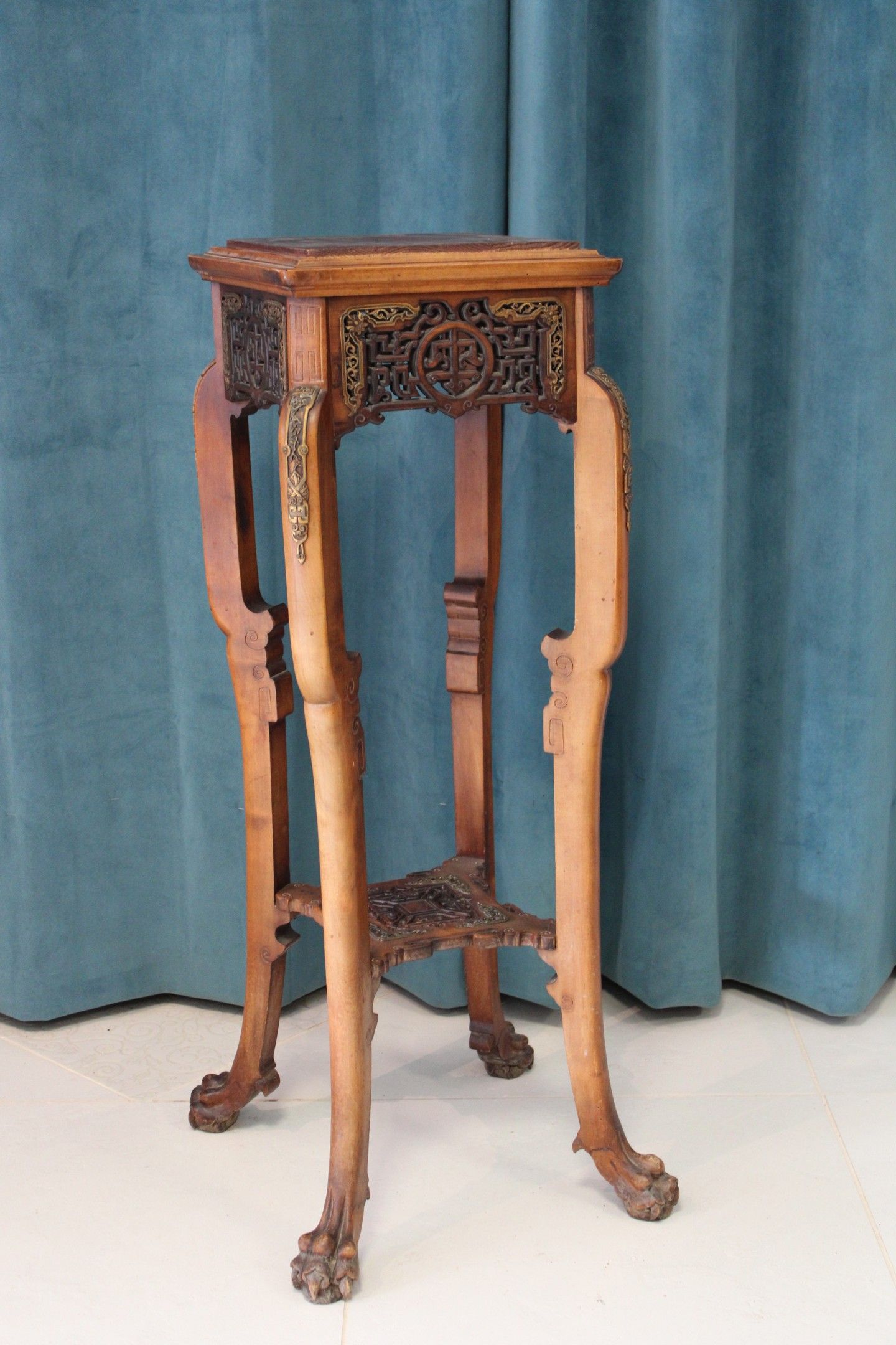 Sellette en bois sculpté à décor stylisé souligné d'éléments en bronze doré, reposant sur quatre pieds reliés par une entretoise ajourée et se terminant par des pattes de lion.