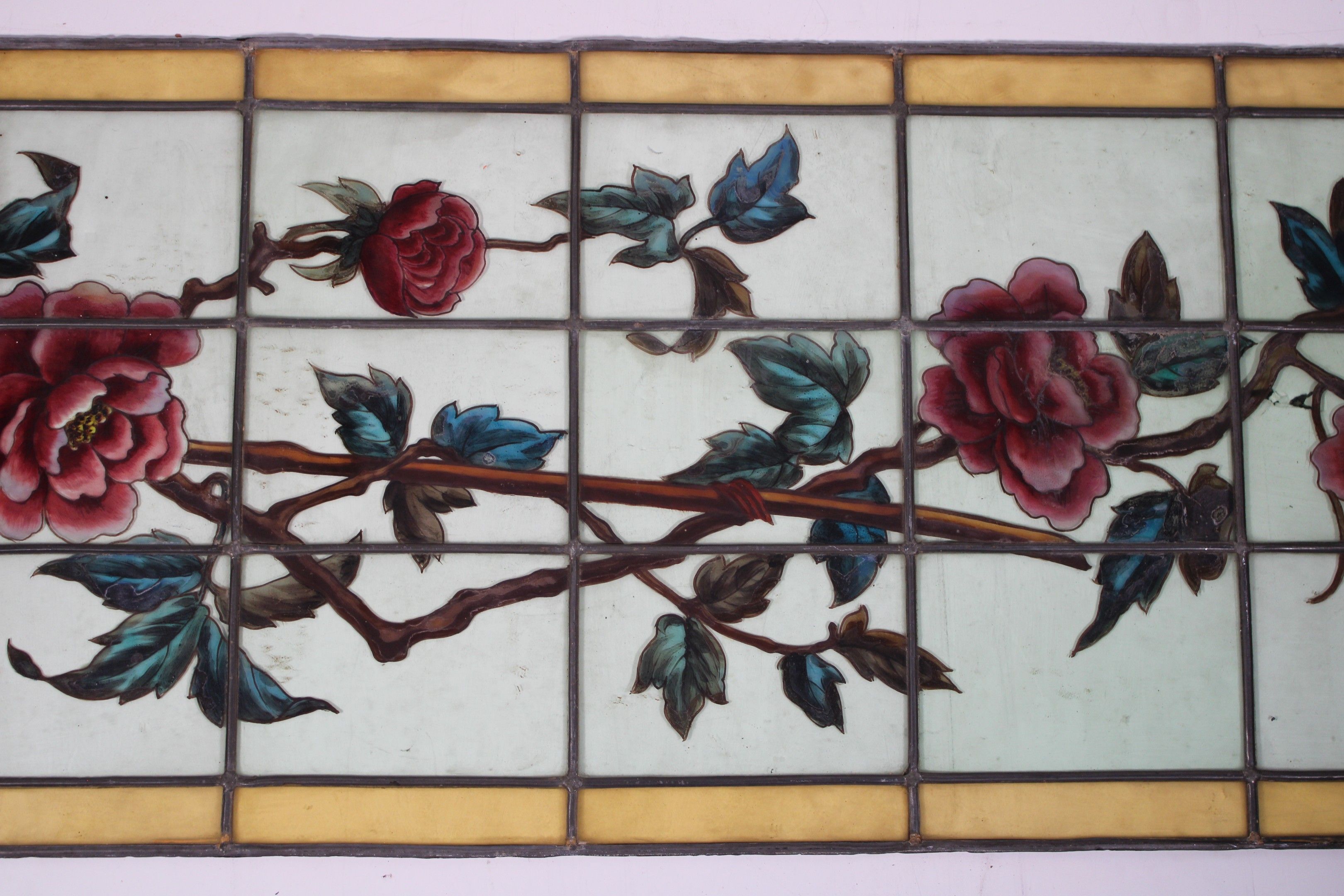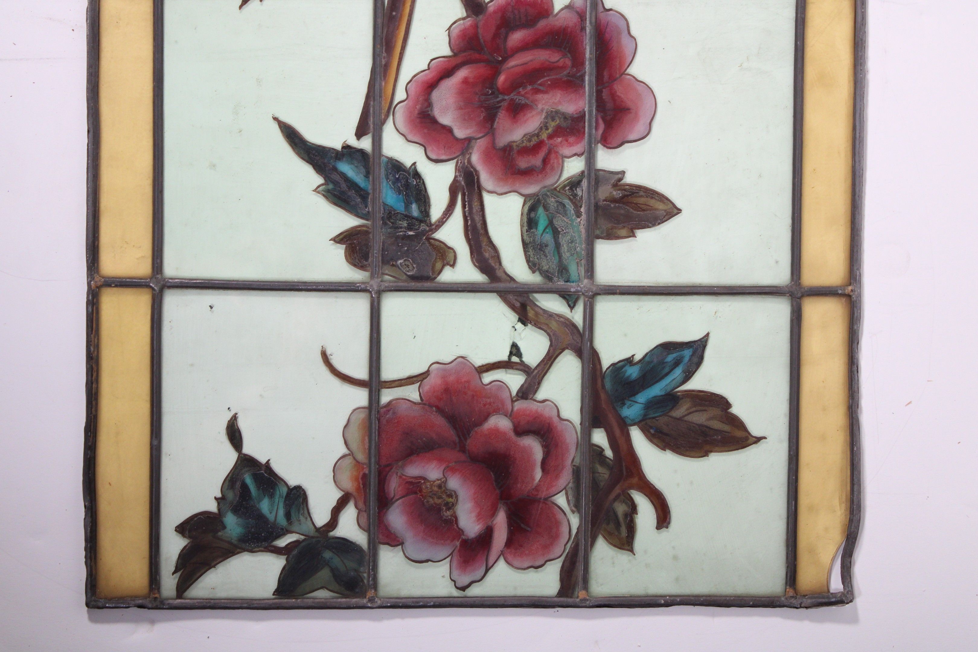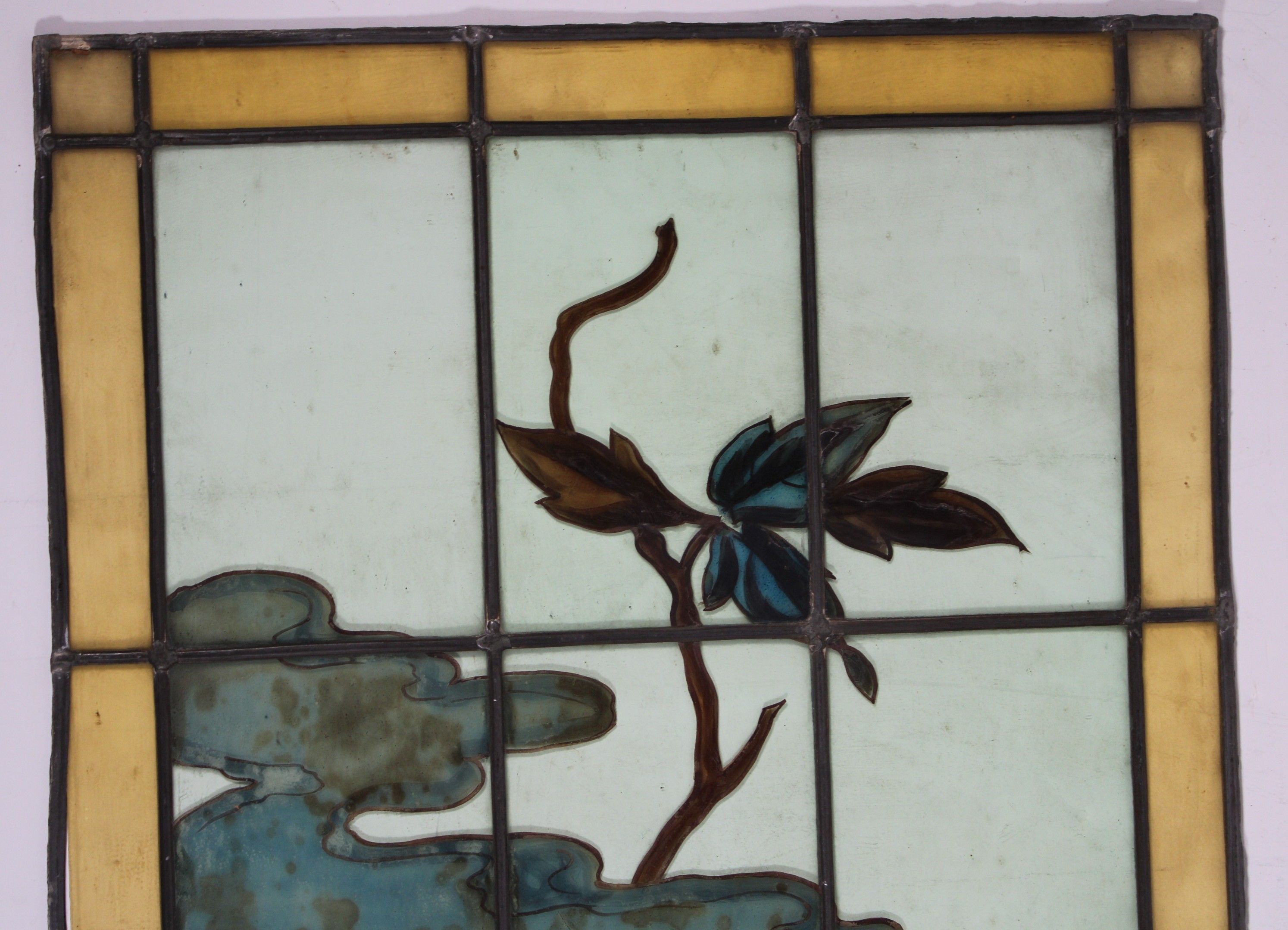 Ensemble comprenant deux vitraux à décor peint d'une branche fleurie et d'une nuée.