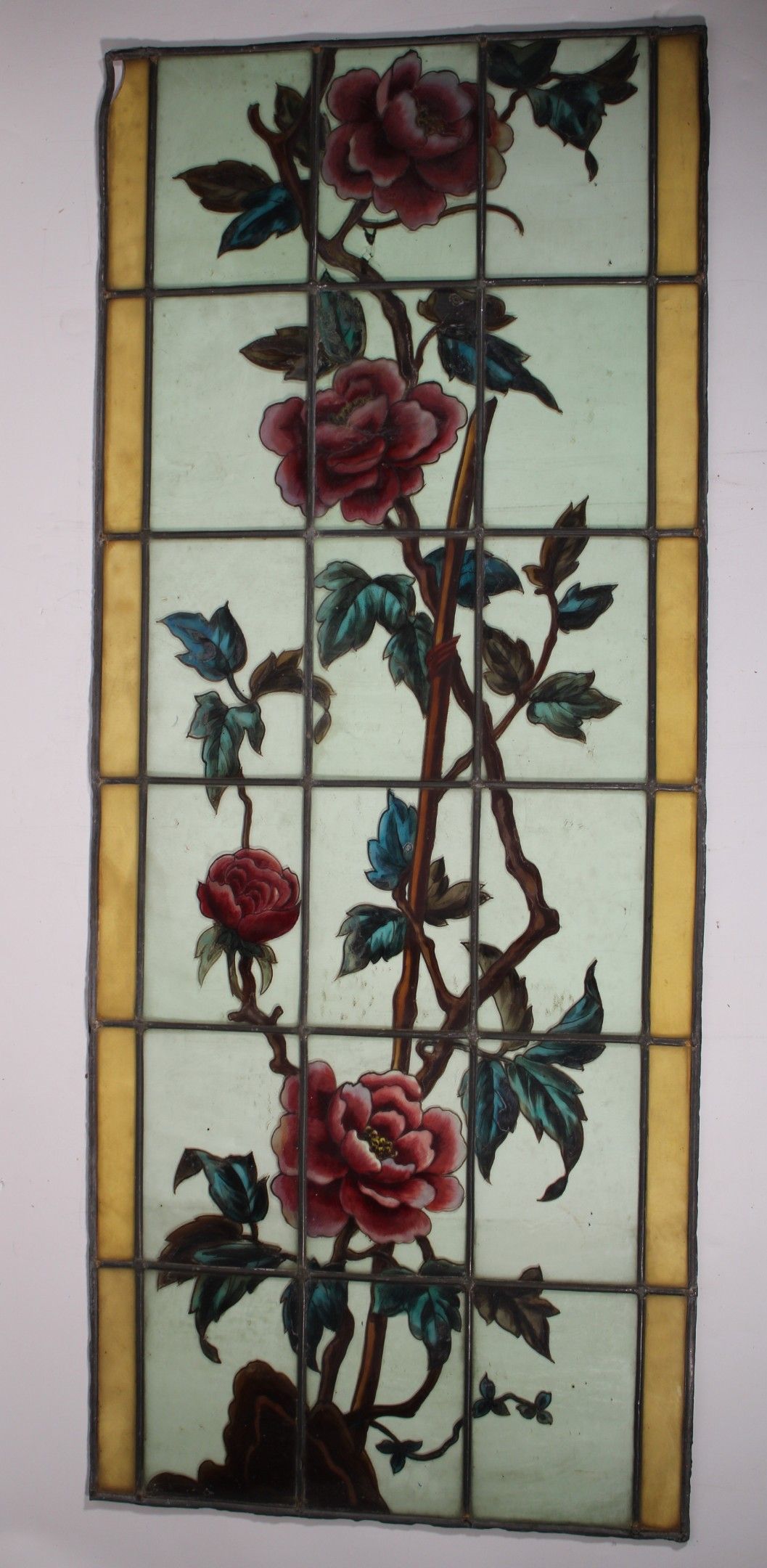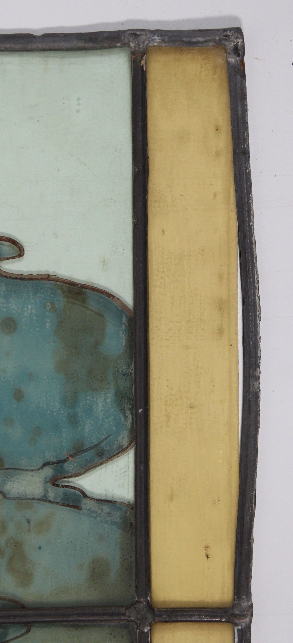 (état d'usage, plombs à refixer, notamment un verre jaune accidenté)