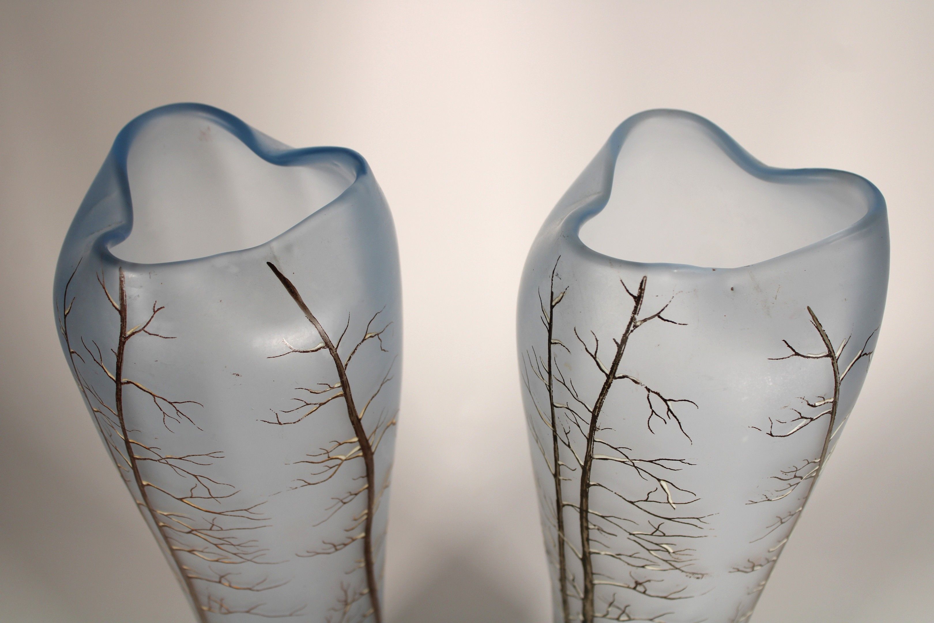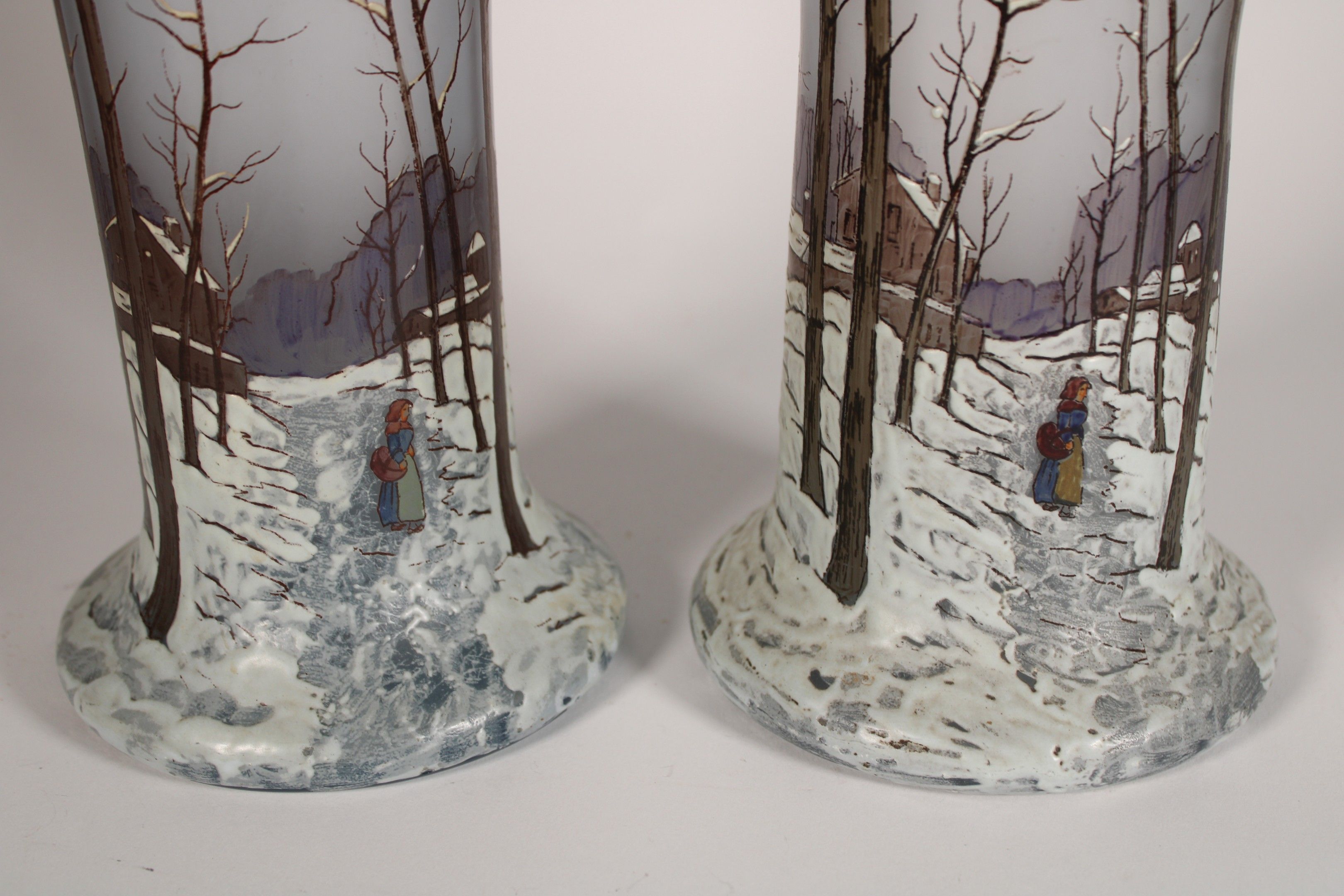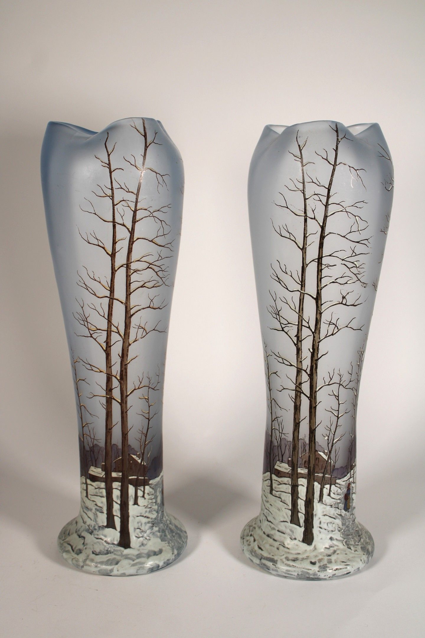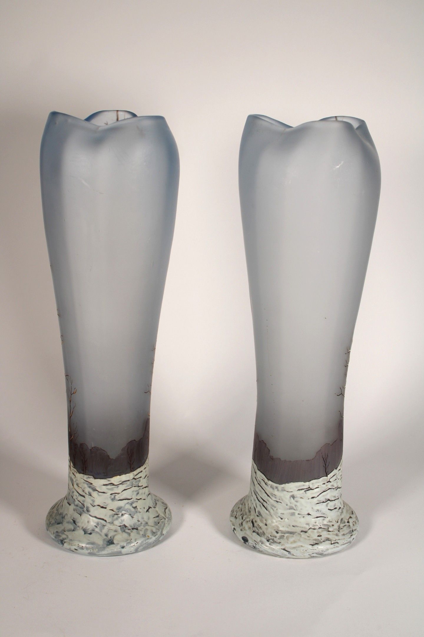 LEGRAS, attribué à Paire de vases en verre givré à décor émaillé polychrome d'un paysage de neige. Hauteur : 41 cm