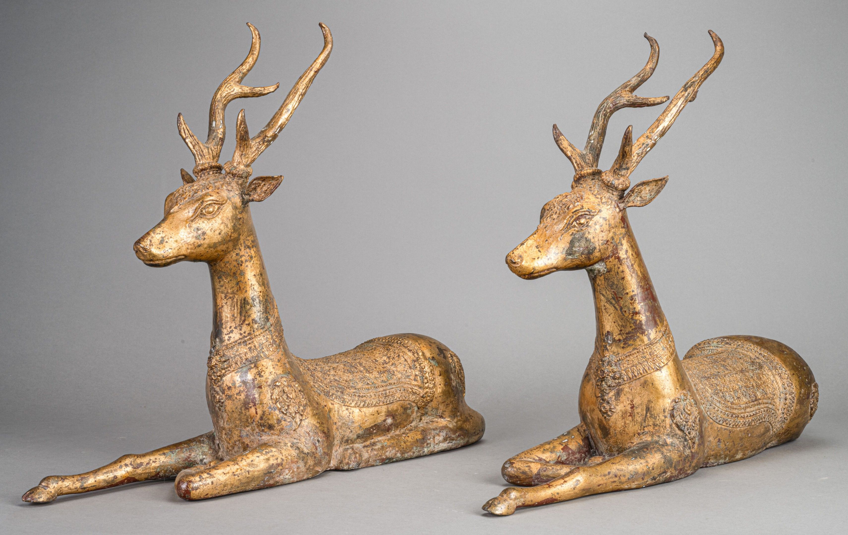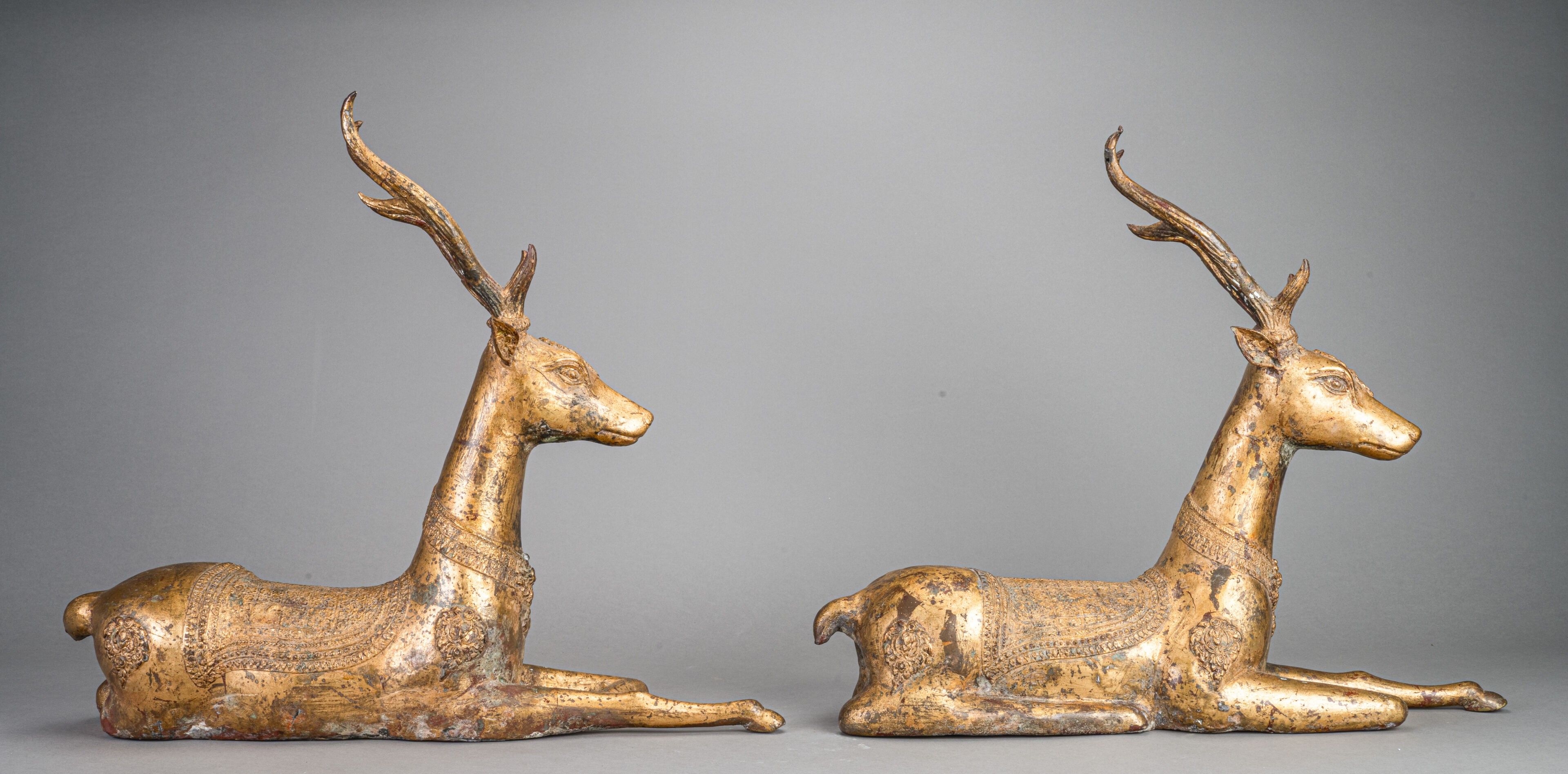 Paire de daims en bronze laqué or, couchés avec une patte avant dépliée, portant un tapis de selle et des parures à motifs floraux au front et à l'encolure.