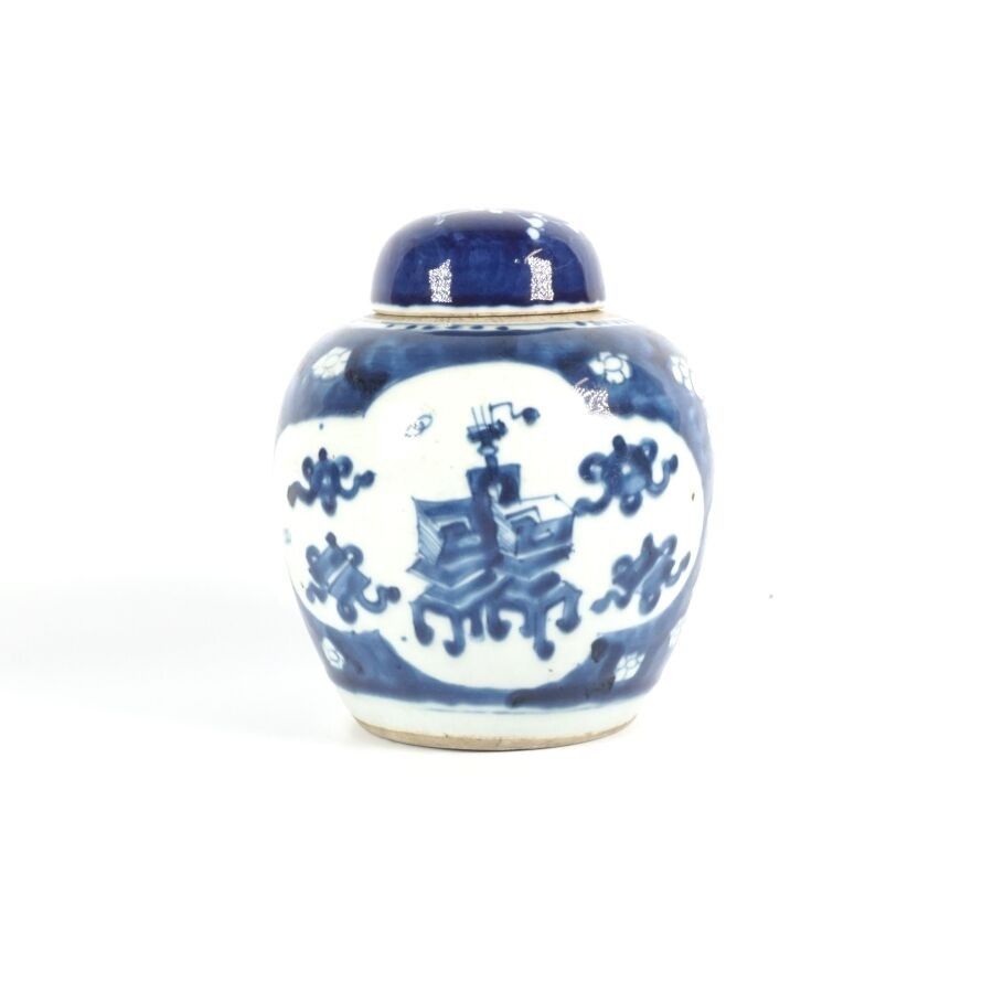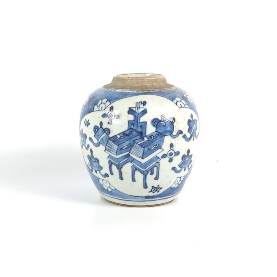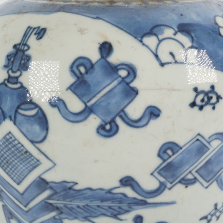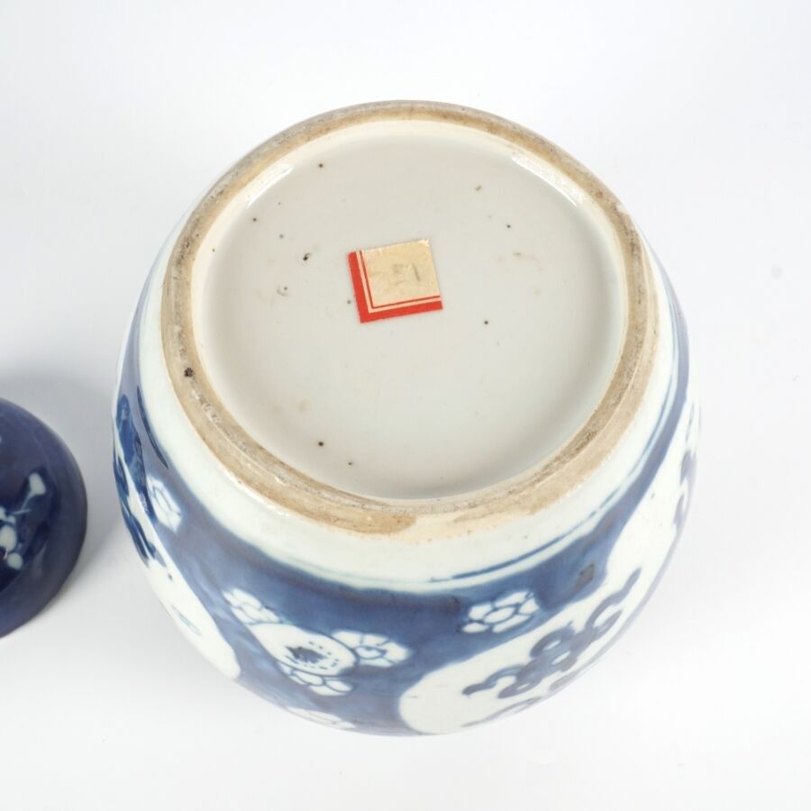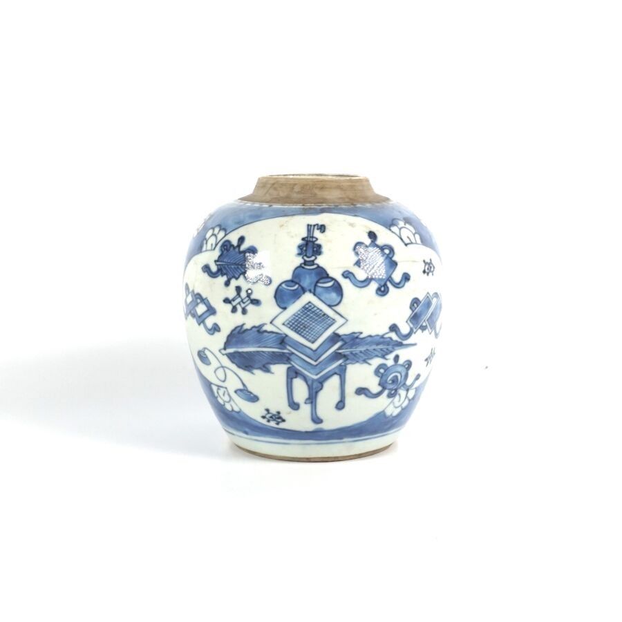 Deux pots à gingembre, en porcelaine blanche à décor en bleu sous couverte, d'objets mobiliers, l'un avec son couvercle, Chine,18ème - 19ème siècle, H. 17 cm et 19.5 cm (un sans couvercle, petit éclat au col de l'un, fêles étoilés sur la panse de celui sans couvercle et rayures).