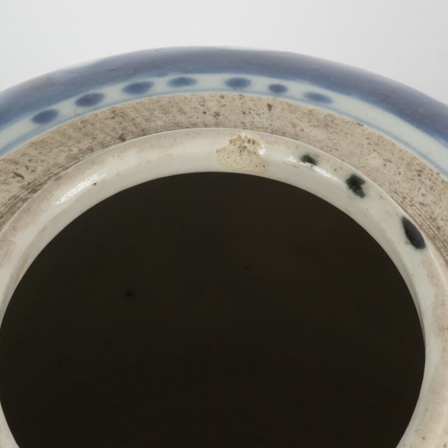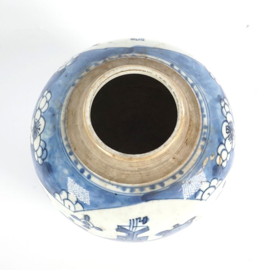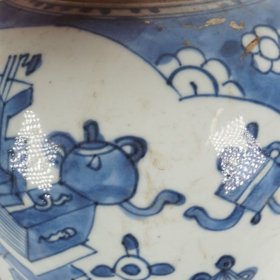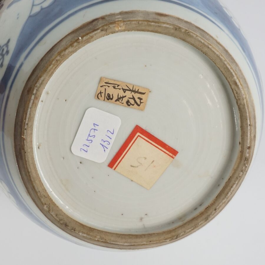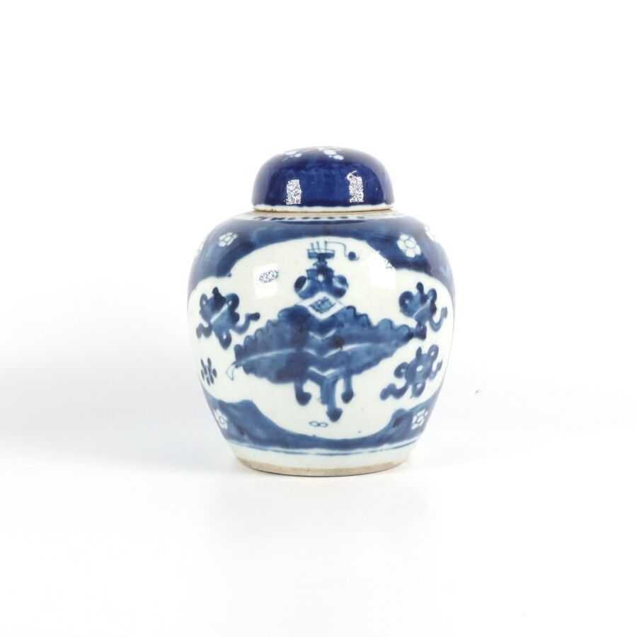 Deux pots à gingembre, en porcelaine blanche à décor en bleu sous couverte, d'objets mobiliers, l'un avec son couvercle, Chine,18ème - 19ème siècle, H. 17 cm et 19.5 cm (un sans couvercle, petit éclat au col de l'un, fêles étoilés sur la panse de celui sans couvercle et rayures).