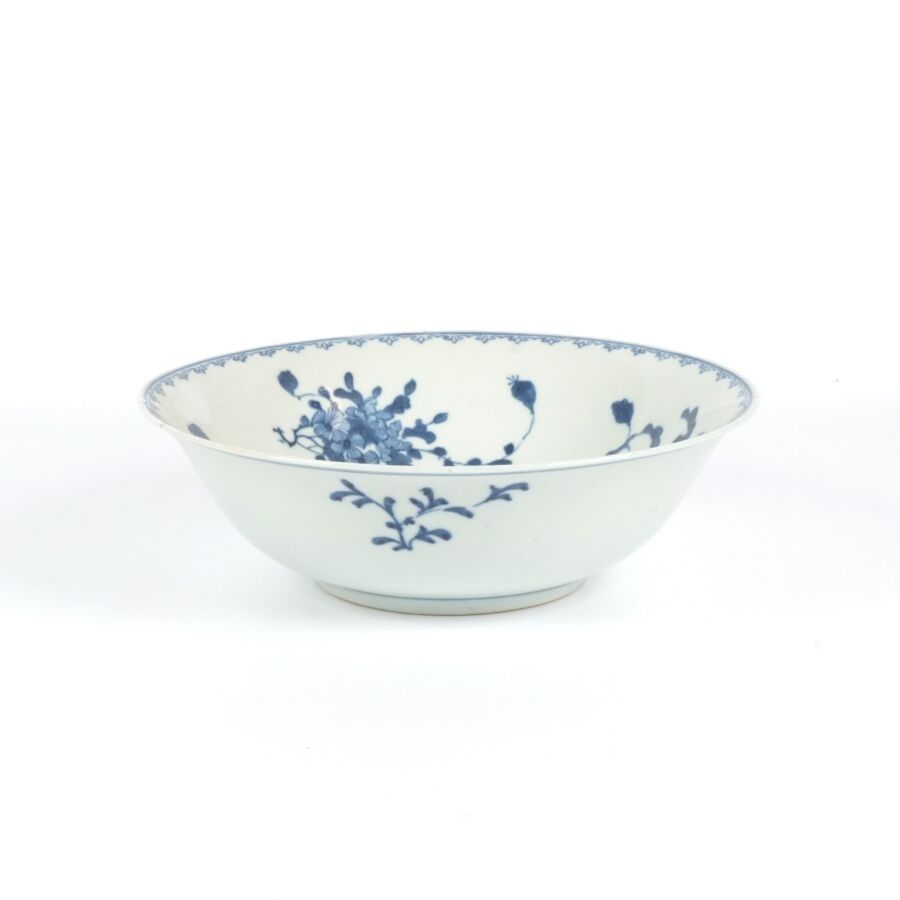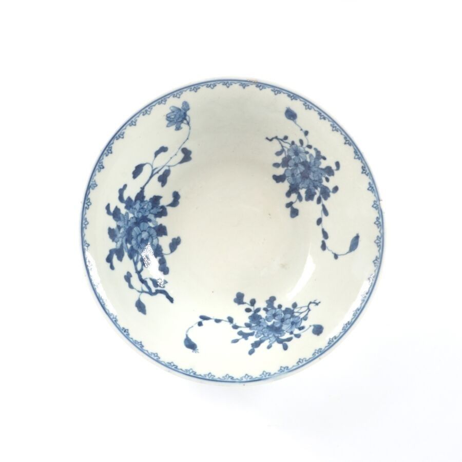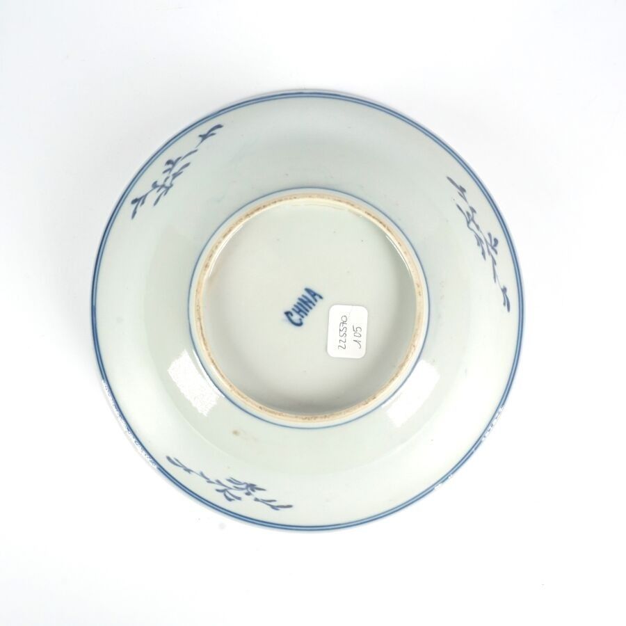 Coupe en porcelaine blanche à décor en bleu sous couverte de compositions florales, marque CHINA au revers, Chine, circa 1900, Diam. 21 cm. H. 6.5 cm.