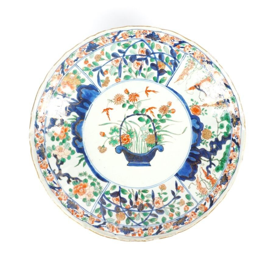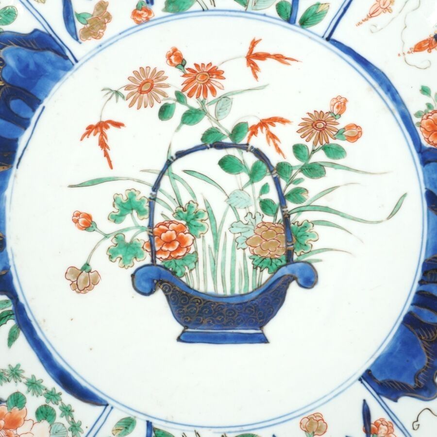 Grand plat en porcelaine émaillée de la famille verte et rehauts d'or, à décor d'un panier garni de fleurs en médaillon central et fleurs sur le pourtour, Chine, époque Kangxi (1661-1722), D. 35,5 cm (petits éclats en bordure et egrenures).
