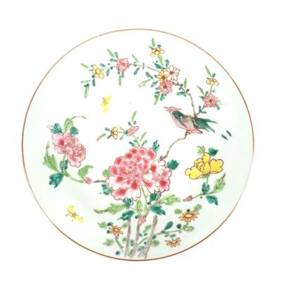 Assiette en porcelaine et émaux polychromes à décor d'oiseau…