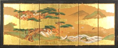 Paravent à six feuilles à l'encre, couleur et rehauts d'or s…