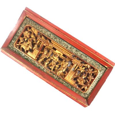 Panneau en bois laqué rouge et réhaussé d'or, à décor sculpt…