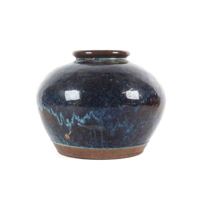 Jarre à panse large et col retroussé, en grès émaillé bleu e…