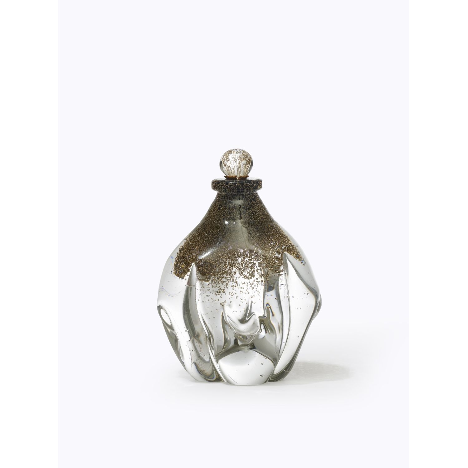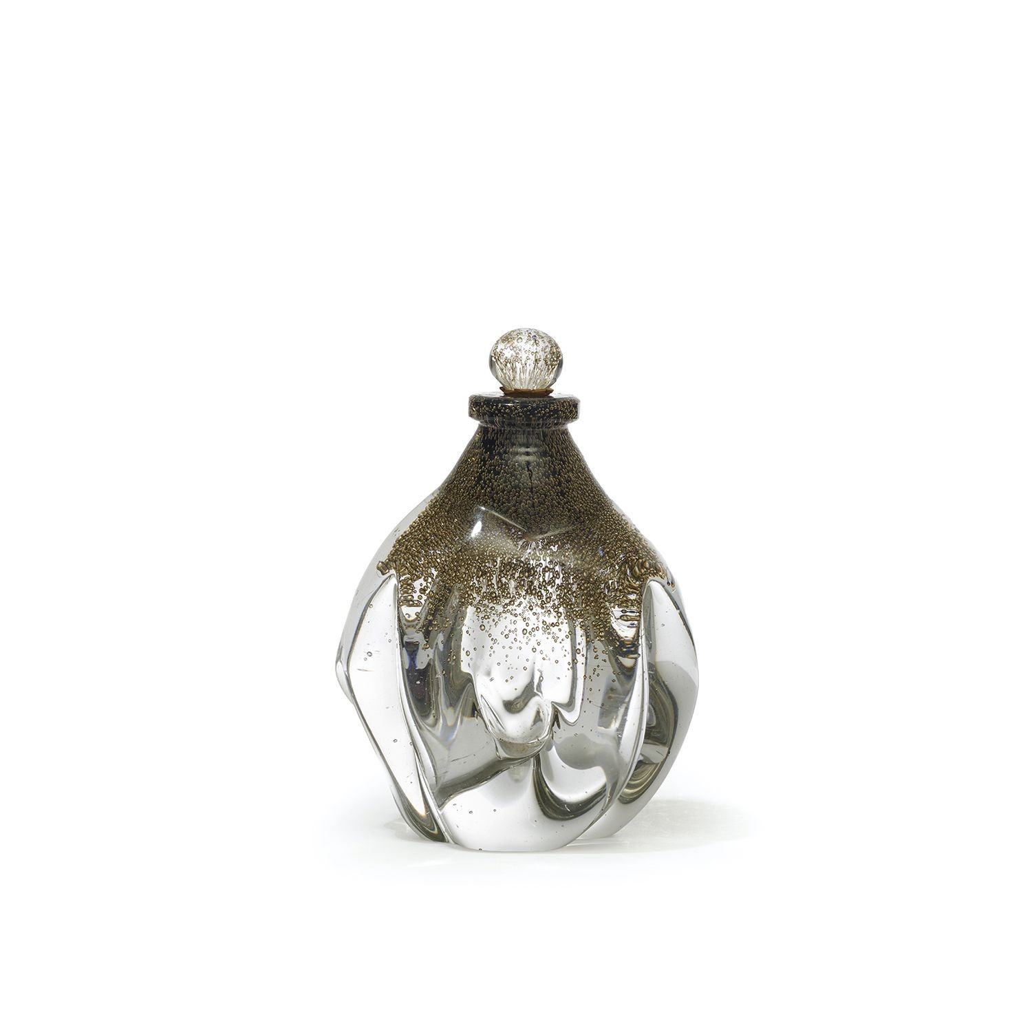 Elégant flacon en épais verre translucide modelé à chaud, à corps piriforme, délicatement animé de fines bulles gris-argent soulignant le col en verre noir. Il est surmonté de son petit bouchon sphérique en verre bullé. Signature manuscrite gravée “Marinot” au revers de la base. Circa 1933