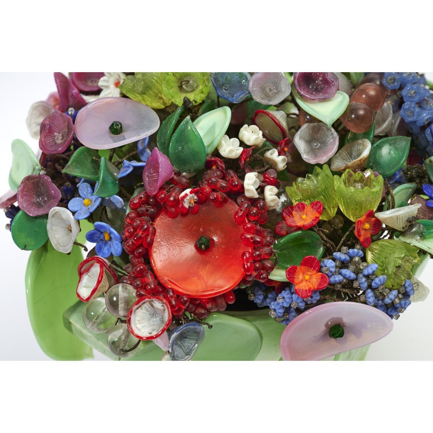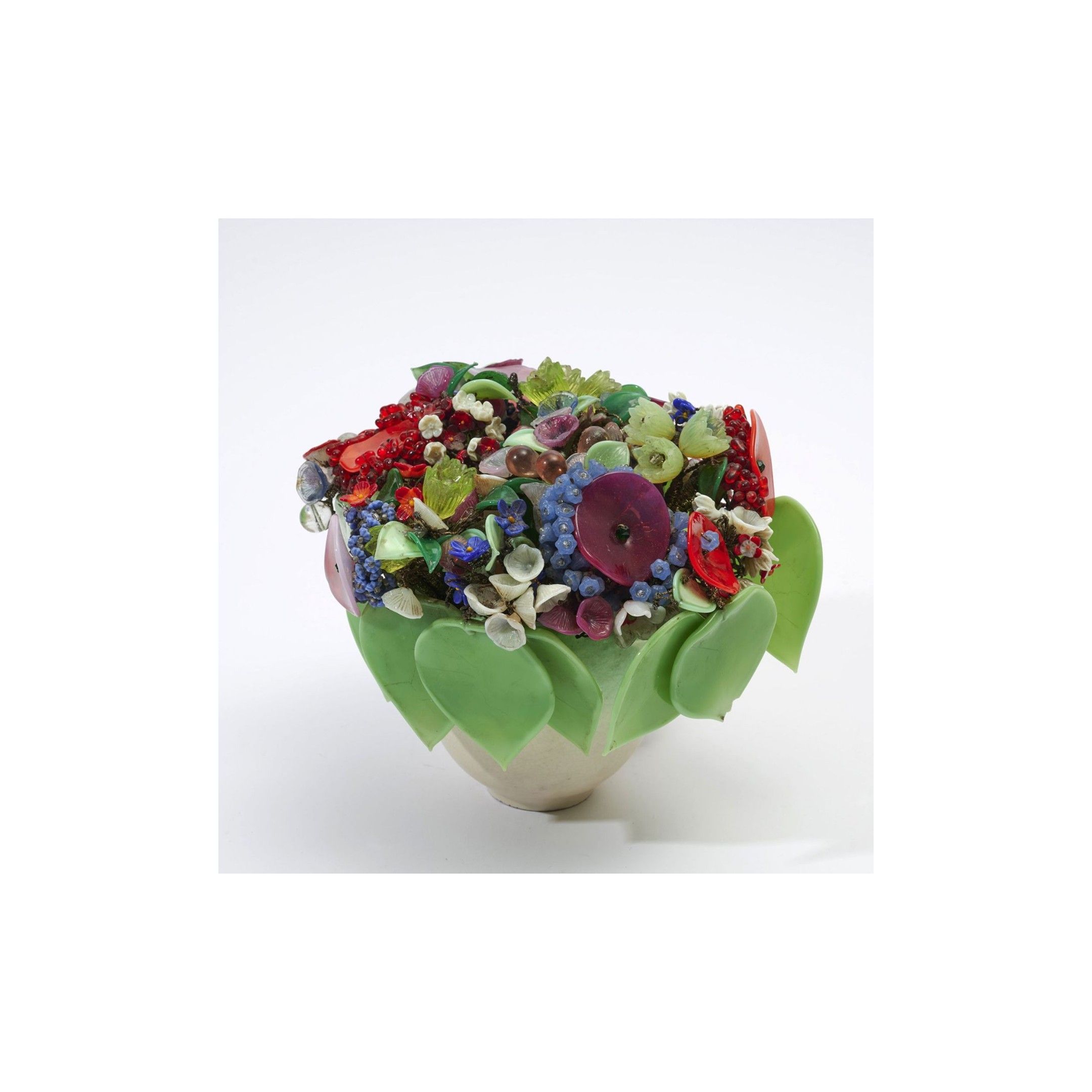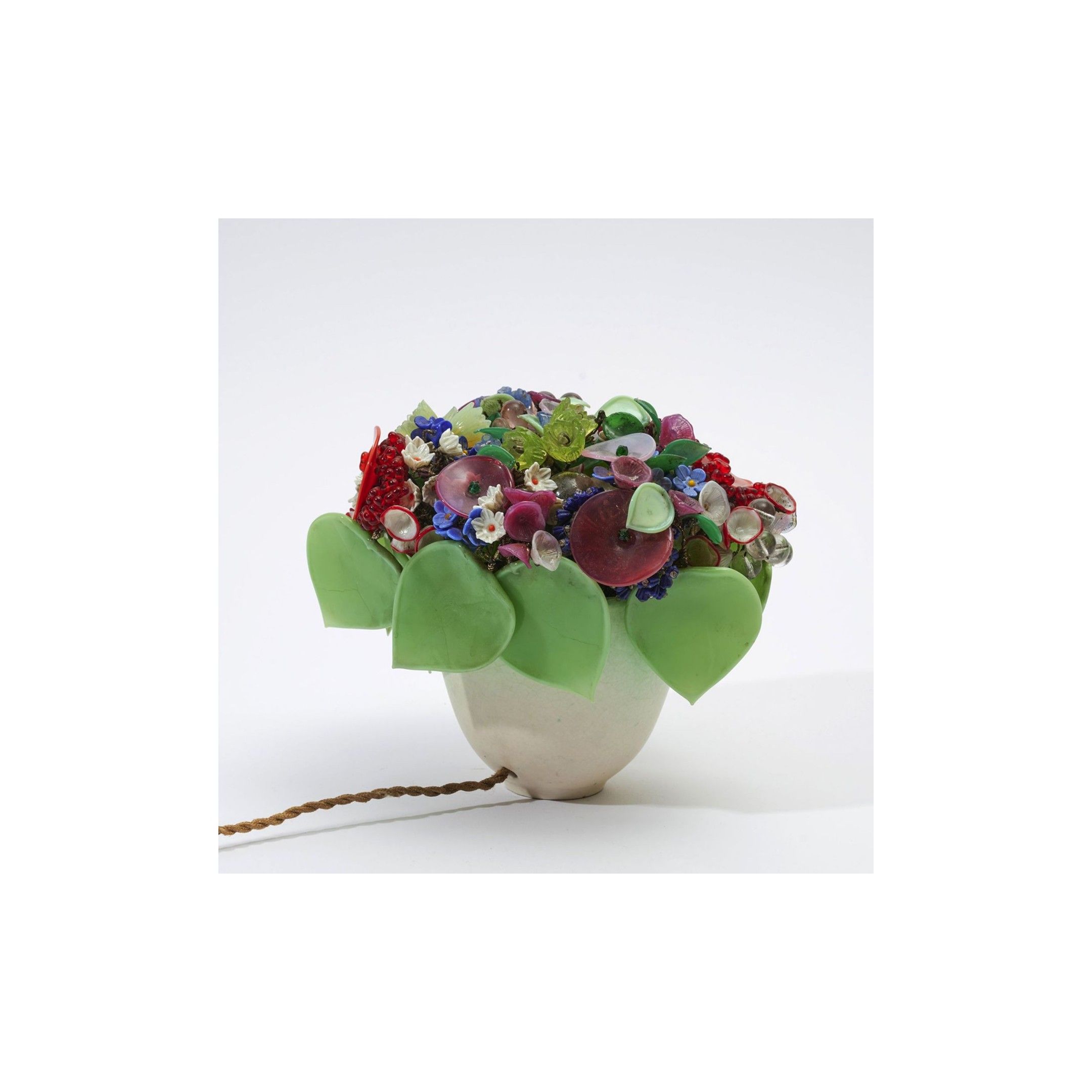 Lampe présentant une composition florale en perles, fleurs, pétales et billes de verre polychrome, l‘ensemble dans un cache-pot en faïence émaillée beige. Circa 1940.