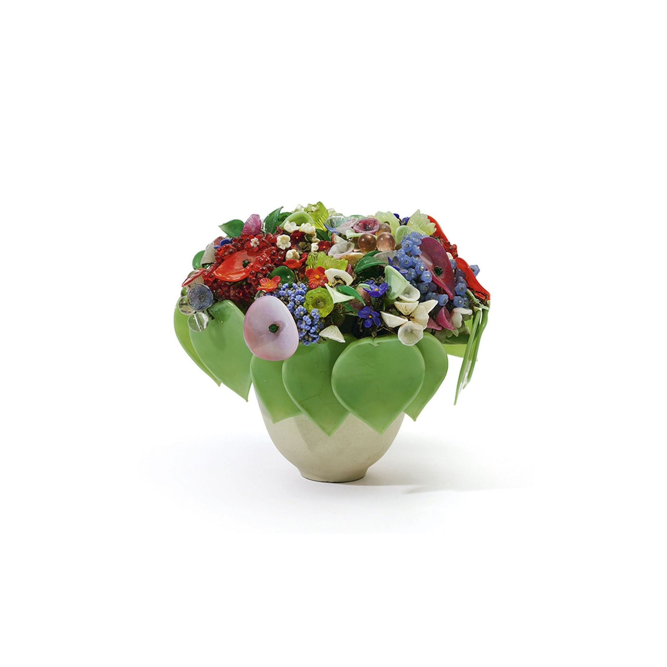 A lamp featuring a polychrome glass floral composition, set in an enamelled earthenware cachepot. (Small damages and losses)